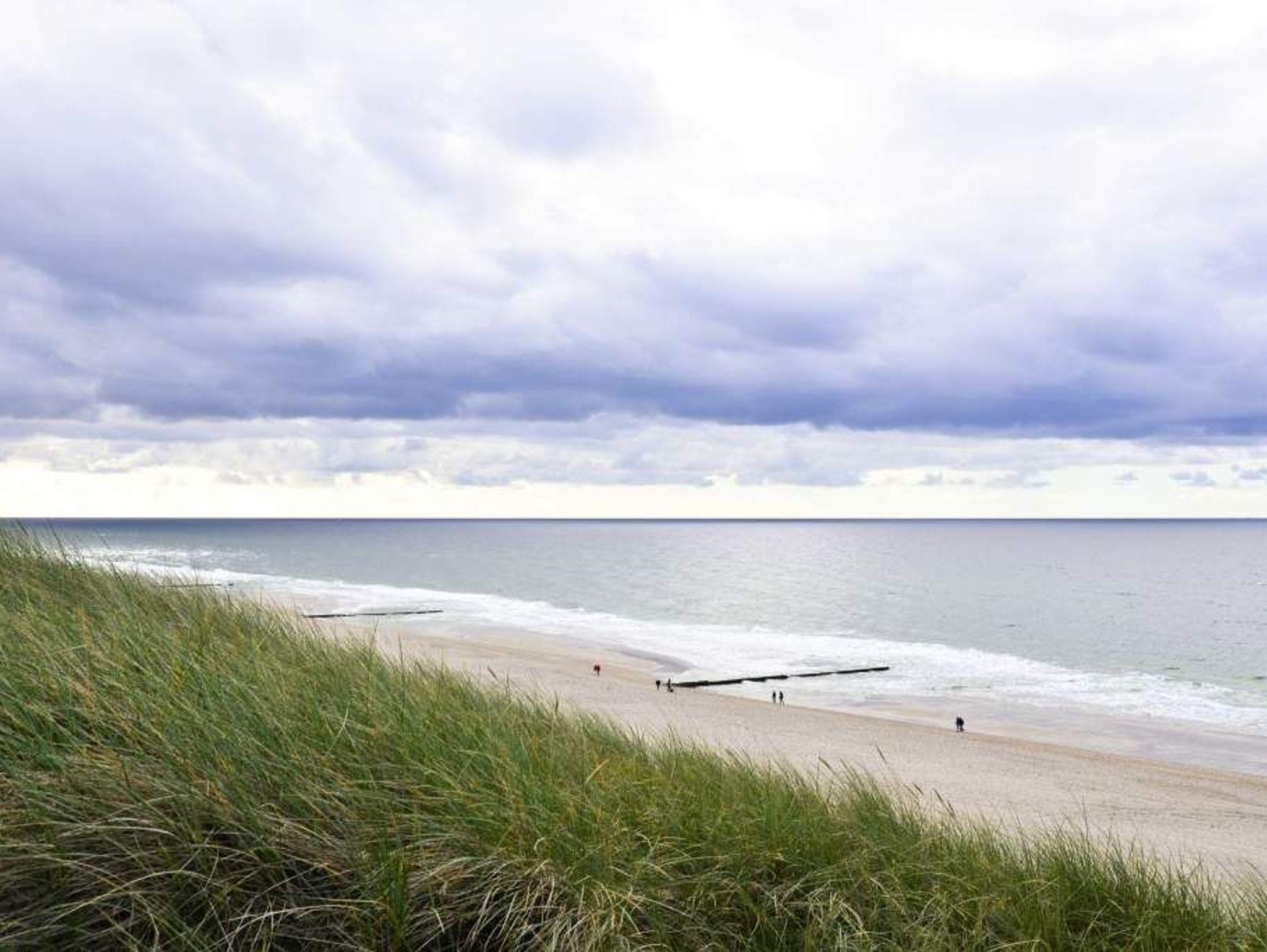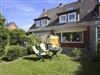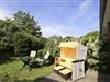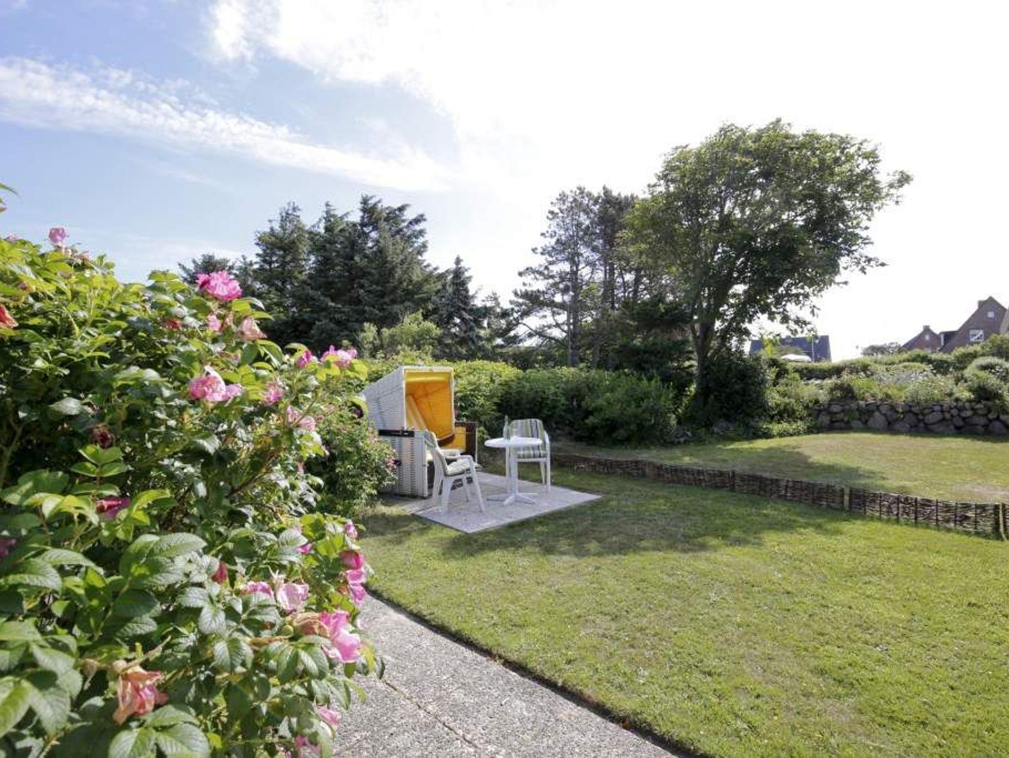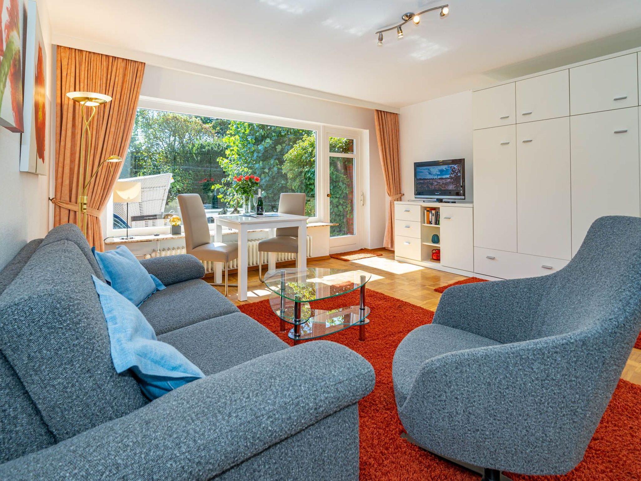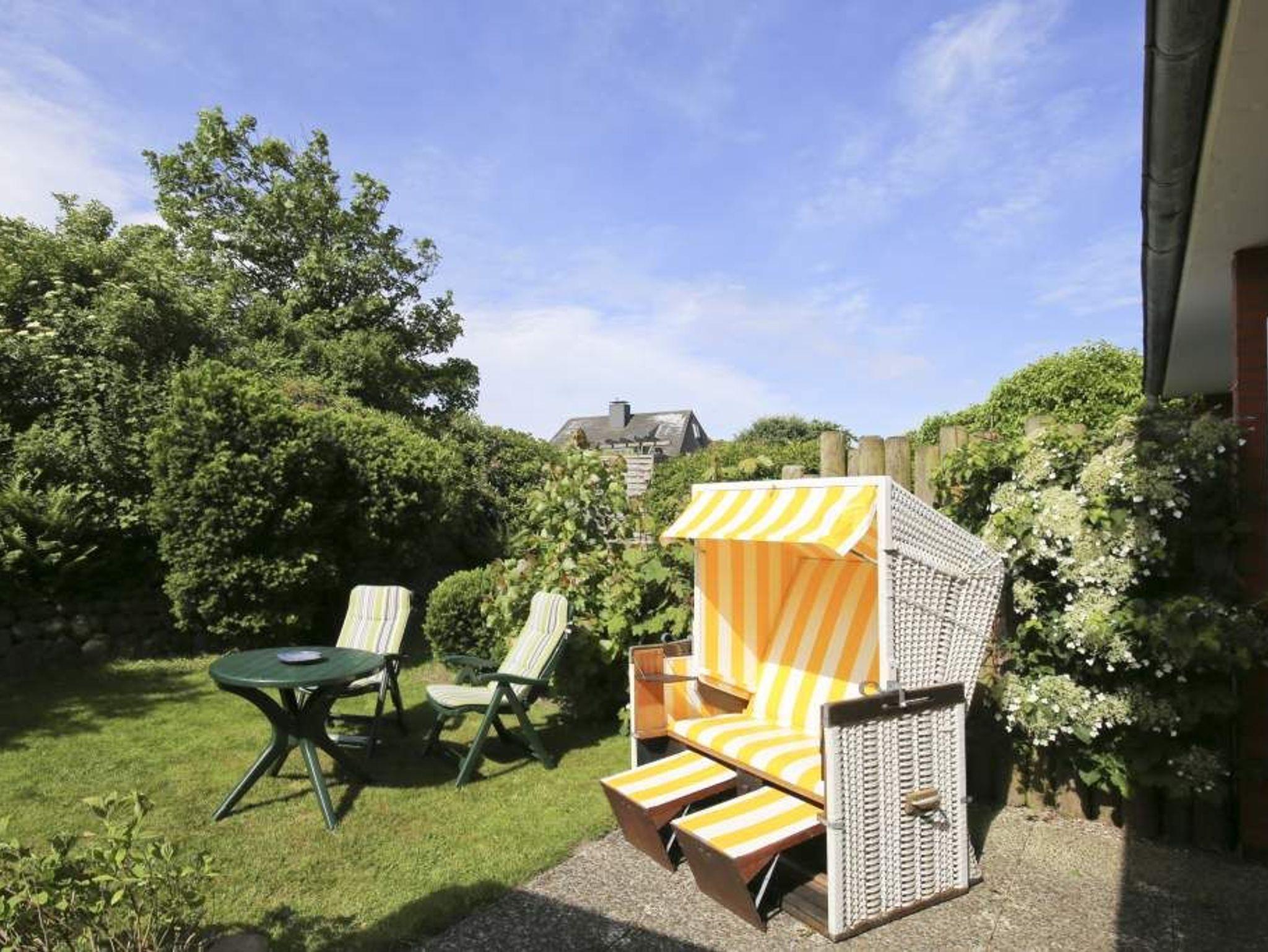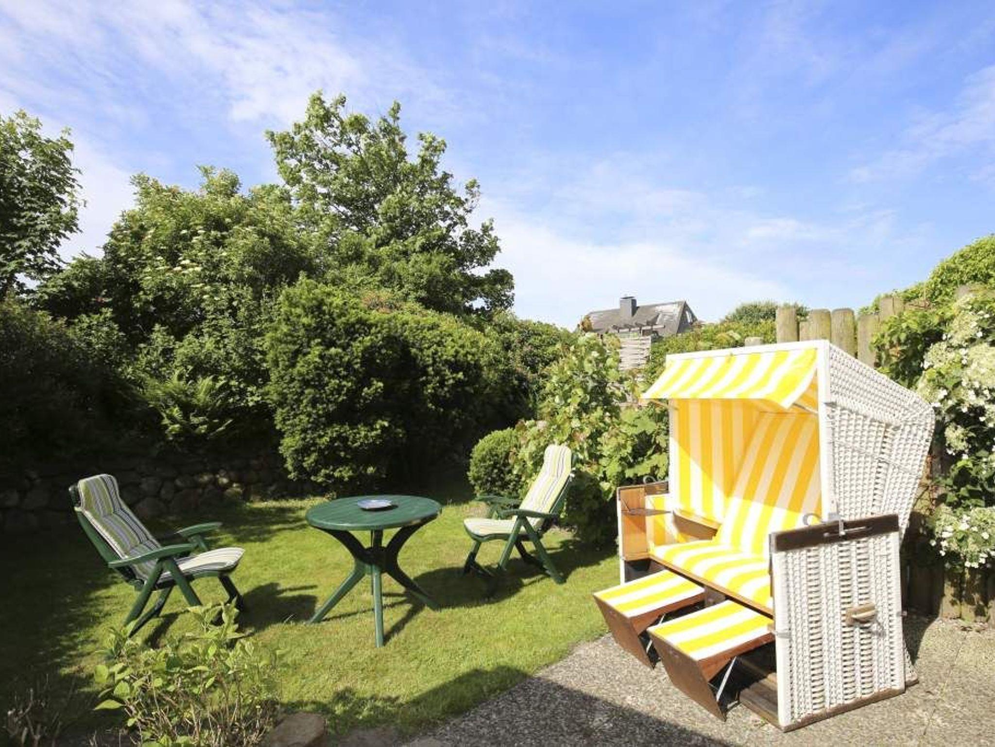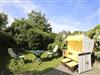 Die nach Süden ausgerichtete Terrasse mit eigenem kleinen Gartenanteil lädt mit Balkonmöbeln, Auflagen und einem Strandkorb zum Sonnenbaden, Frühstücken im Freien oder einfach zum Entspannen ein.