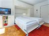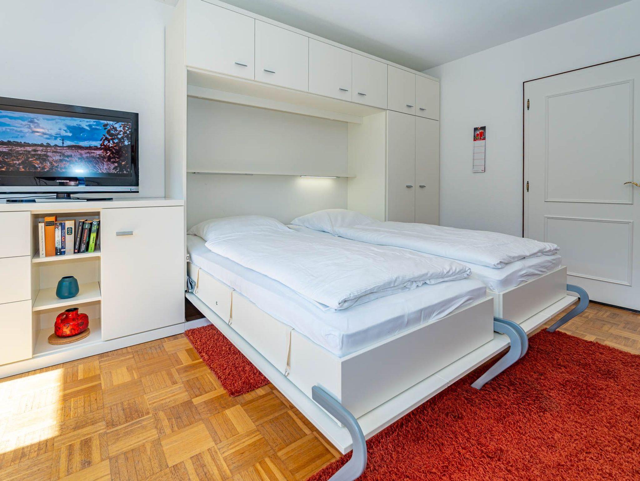 Vom Vorflur mit Garderobe erreichen Sie den hellen, kombinierten Wohn- und Schlafraum, das separate Duschbad sowie die freundliche, gut ausgestattete Küche mit Fenster. Der Wohn-/Schlafbereich ist mit echtem Parkettboden, einem bequemen Zweisitzer-Sofa, einem Sessel mit Fußhocker sowie zwei einzeln ausklappbaren Doppelschrankbetten eingerichtet. Für Unterhaltung sorgen ein Kabel-Flachbild-TV, WLAN (ohne Gewähr) und eine Radio-/CD-Anlage.