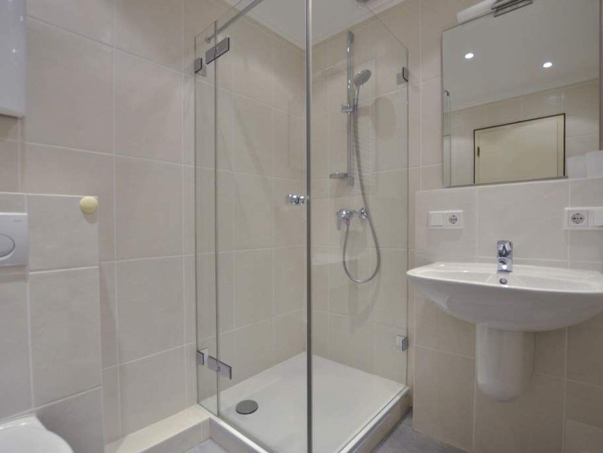 Das moderne Duschbad verfügt über eine ebenerdige Dusche, einen Handtuchtrockner sowie einen festinstallierten Fön ? hell, funktional und stilvoll gestaltet.