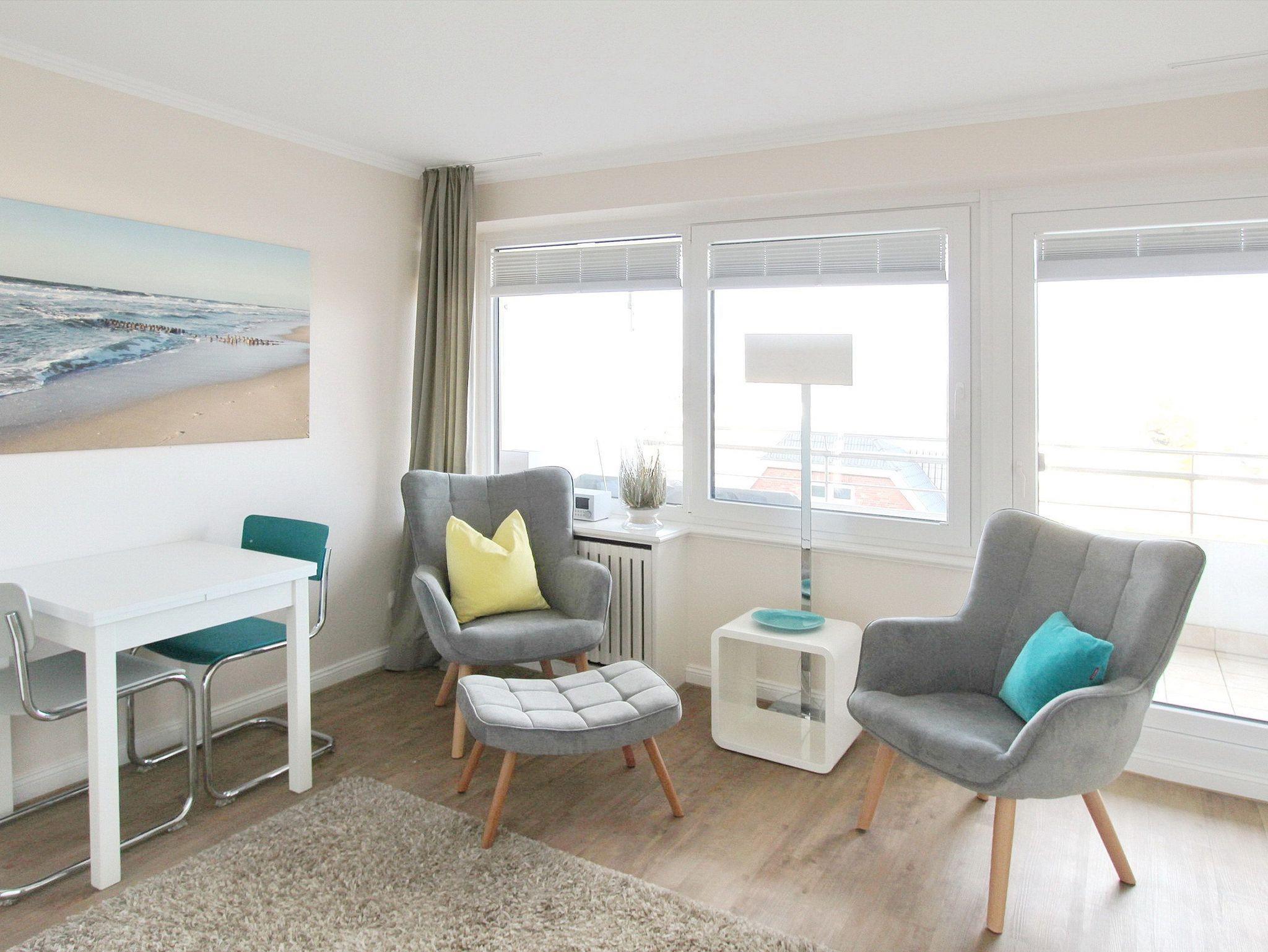 Direkt am Strandübergang Seestraße befindet sich diese kleine Wohlfühloase im Dünenhof zum Kronprinzen in der 2. Etage. Die Wohnung ist hell und freundlich und im Frühjahr 2020 neu eingerichtet worden. Der kombinierte Wohn-/Schlafraum mit vorgelagertem Ostbalkon verfügt über Designfussboden. Das neue Doppelschrankbett verspricht höchsten Schlafkomfort. Es gibt einen Essplatz mit 2 Stühlen und 2 große Sessel mit einem Fusshocker für Lese-oder Fernsehabende. Ein Kleiderschrank und eine Kommode sorgen für viel Stauraum für Ihre persönlichen Dinge. Das großzügige Badezimmer hat eine Dusche, Fön, Kosmetikspiegel und einen beheizten Handtuchtrockner. Damit sie sich selbst verpflegen können gibt es im Flur eine Einbauküche mit Mikrowelle, Ceranfeld, zusätzlicher Nespresso Maschine und Geschirrspüler. Zur technischen Ausstattung dieser Wohnung gehört : ein Flachbildfernseher, ein Radio. Ein freier WLAN Hotspot (Duenenhof zum Kronprinzen - Passwort im Appartement - ohne Gewähr) steht ihnen kostenfrei zur Verfügung und den WLAN Anschluss des Eigentümers können Sie auch nutzen (die Zugangsdaten stehen auf dem Router). Diese Nichtraucherwohnung hat eine Größe von ca. 30 m².