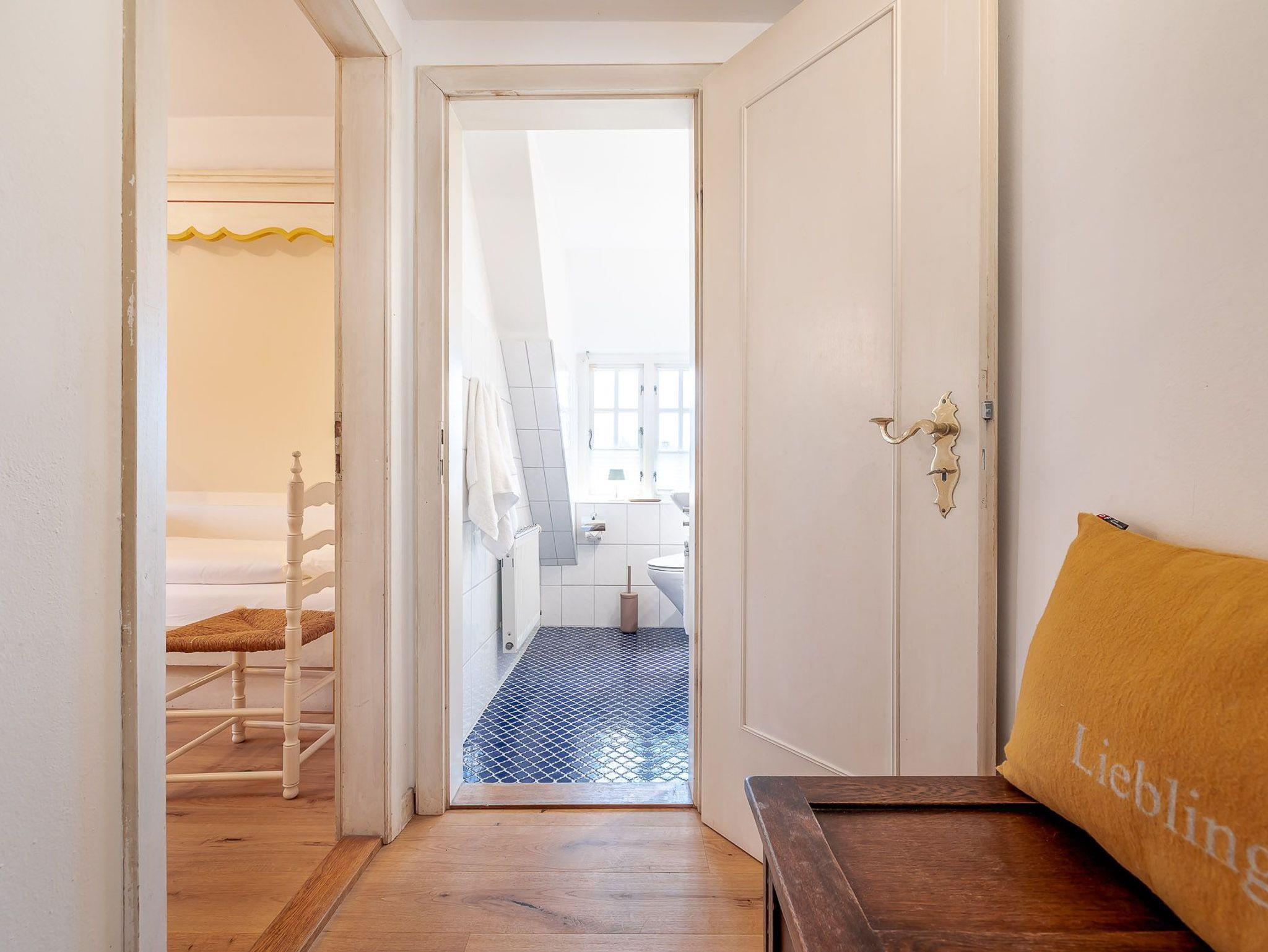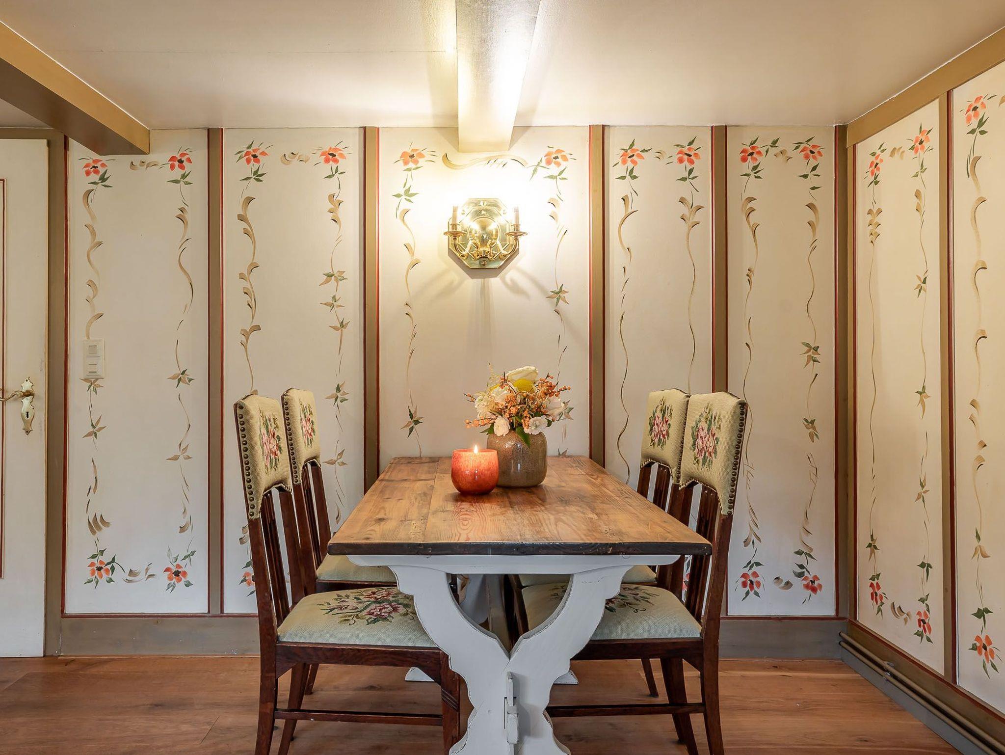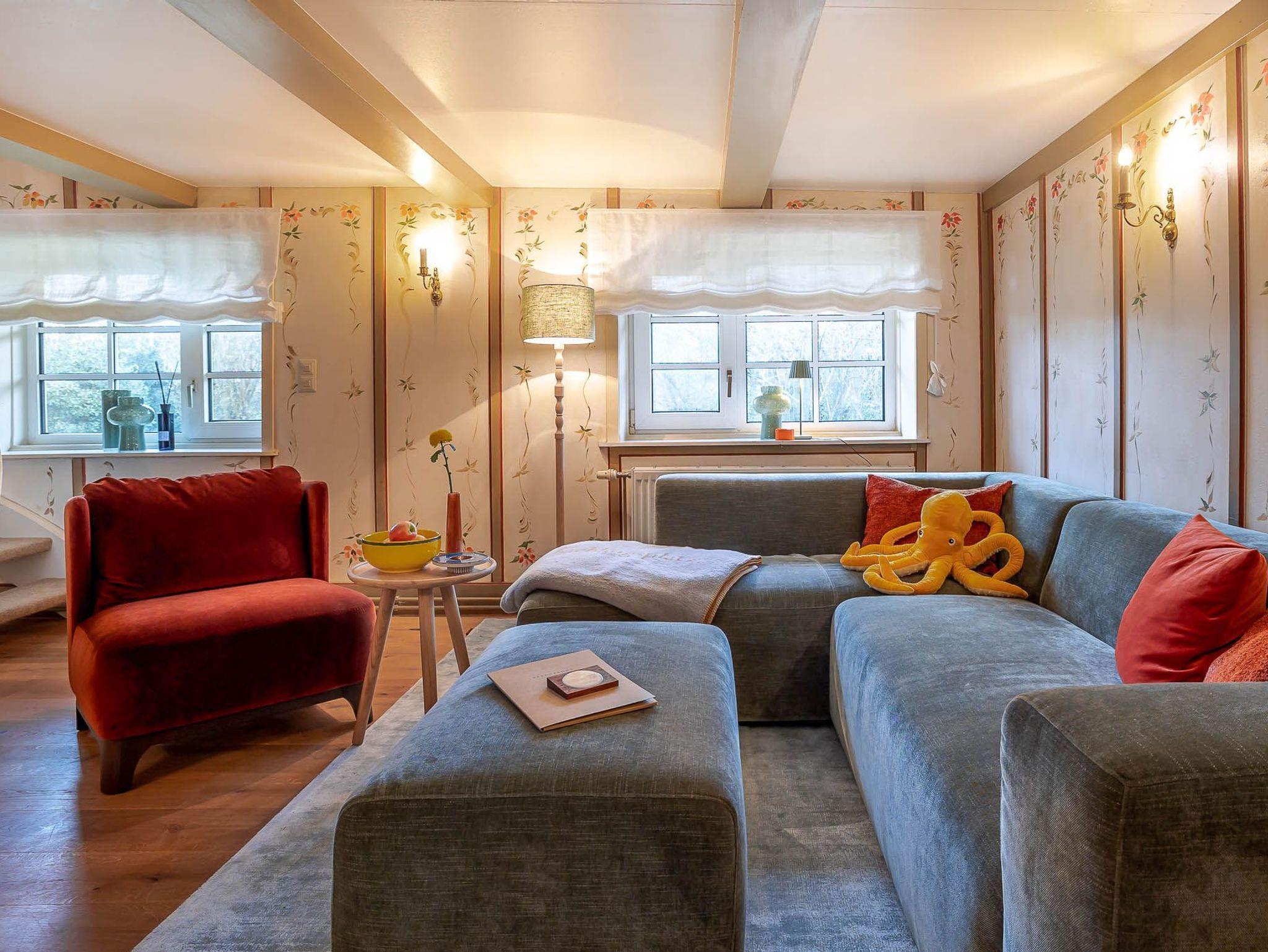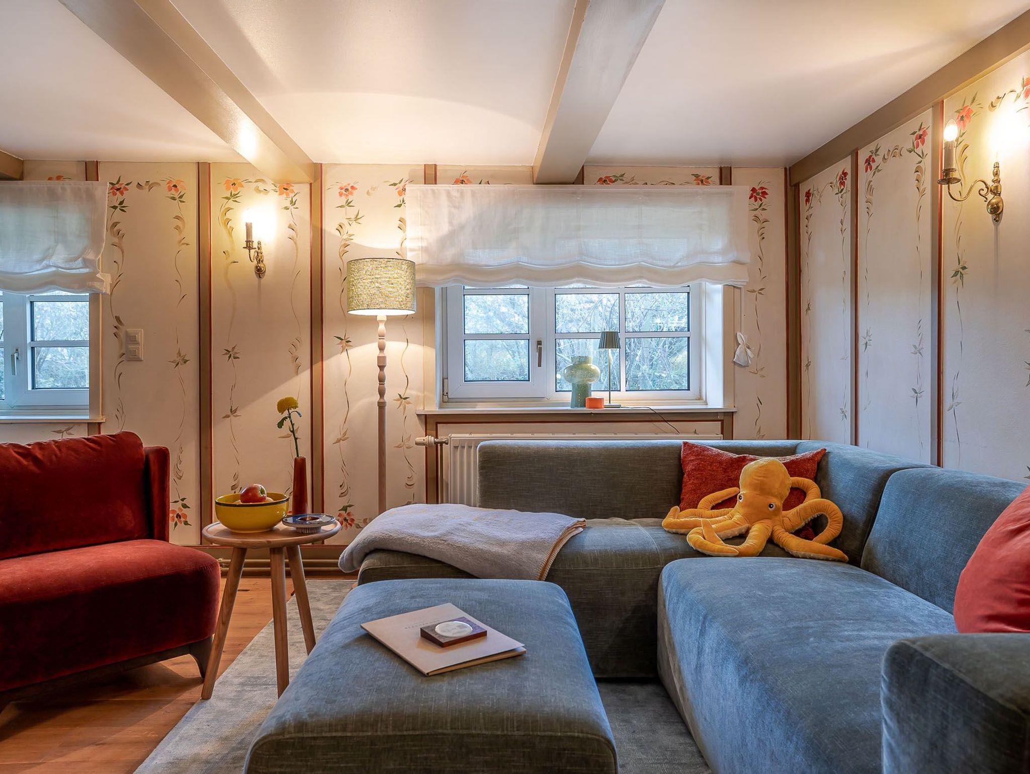 Auf zwei Etagen bietet unsere Ferienwohnung alles, was das Herz von vier Personen begehrt. Der rosafarbene Flur, die hellgelbe Decke und die 50 Jahre alten handbemalten Wandmalereien bieten den perfekten Mix aus Alt und Neu. Die farbenfrohe Einrichtung, verbunden mit dem alten Charme, sorgt für einen gemütlichen Aufenthalt. Auf der unteren Etage befindet sich ein geräumiges Bad mit Dusche, eine kleine Küche und der Wohnbereich. Dieser lädt mit seiner wohnlichen Atmosphäre zu gemeinsamen Stunden am Tisch oder auf der gemütlichen Sofalandschaft ein. Die obere Etage verfügt über zwei Schlafzimmer mit jeweils zwei Alkoven-Einzelbetten und ein weiteres WC.