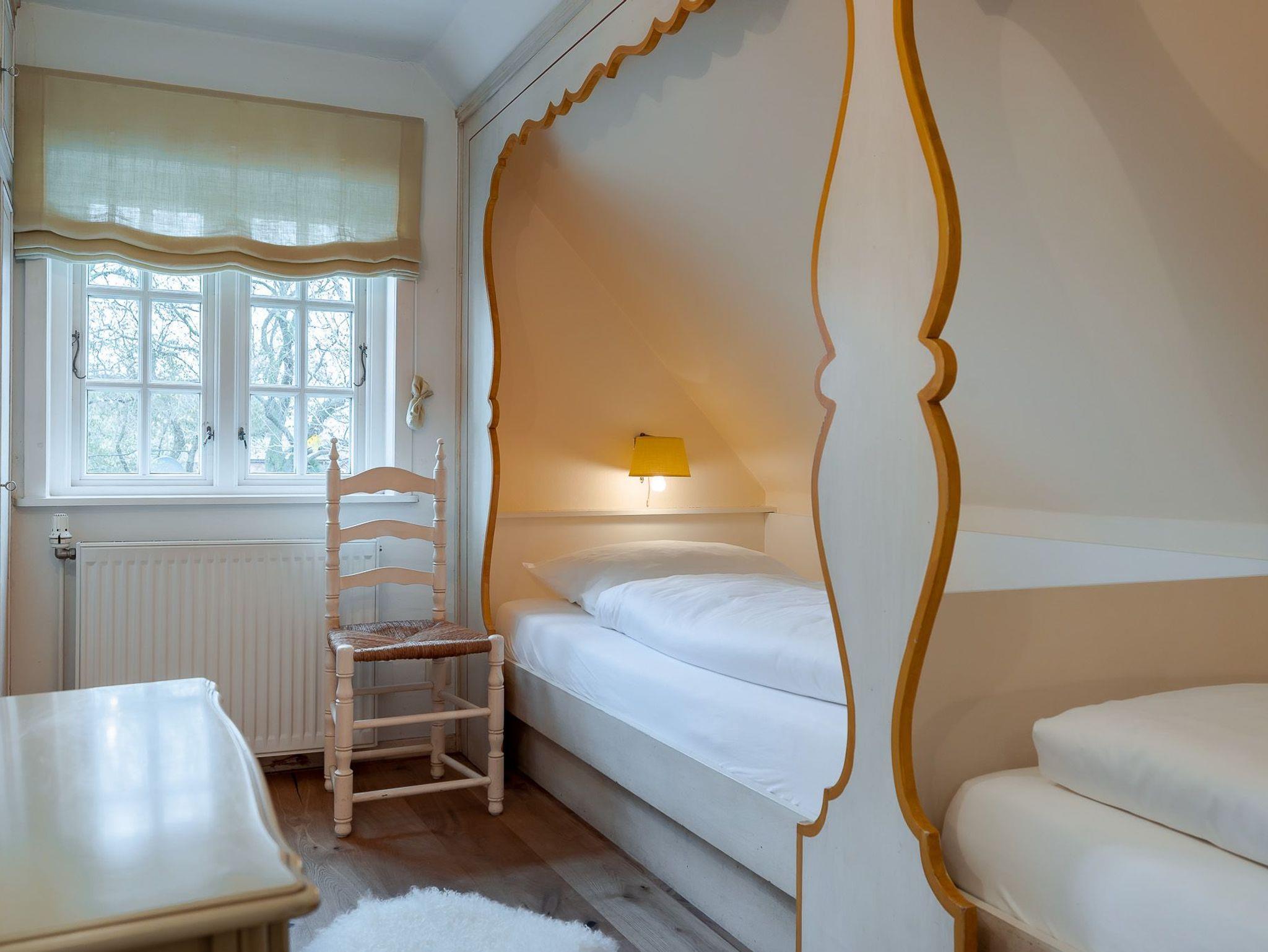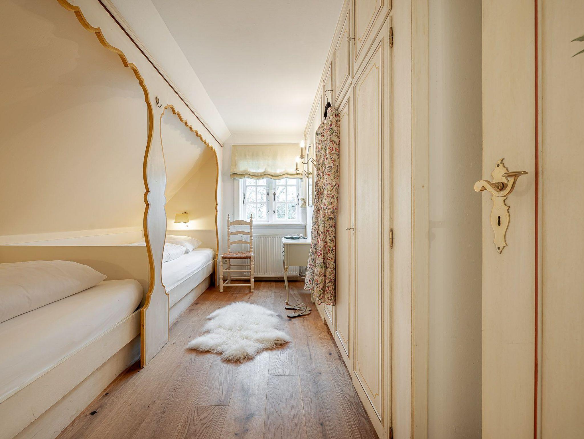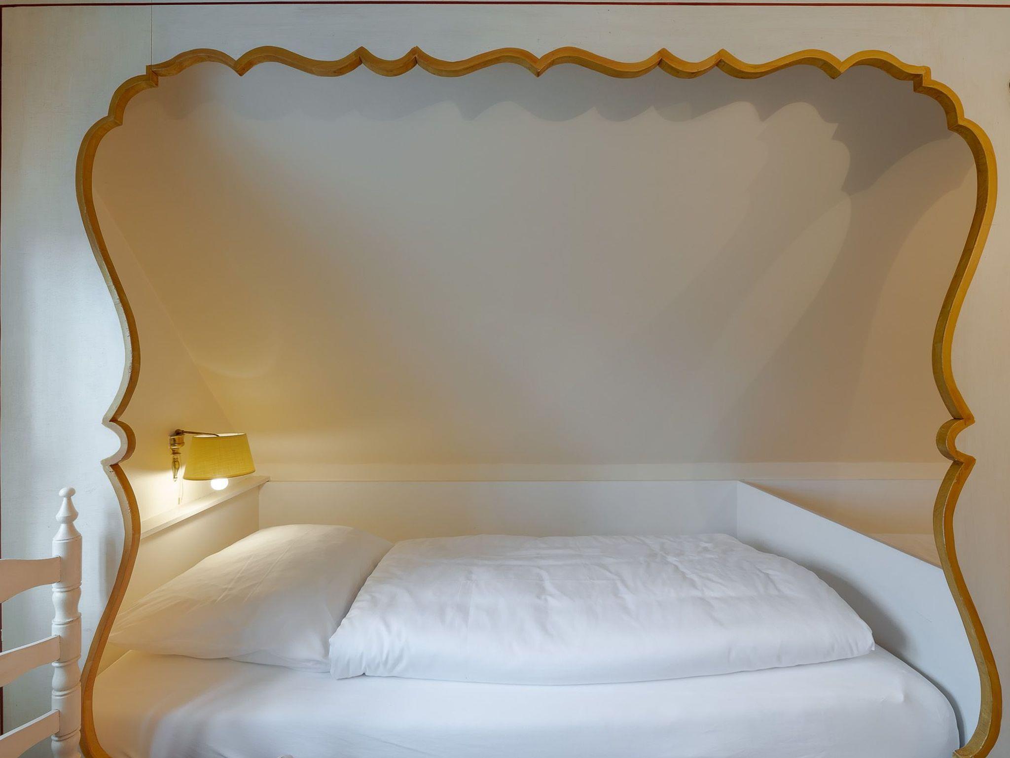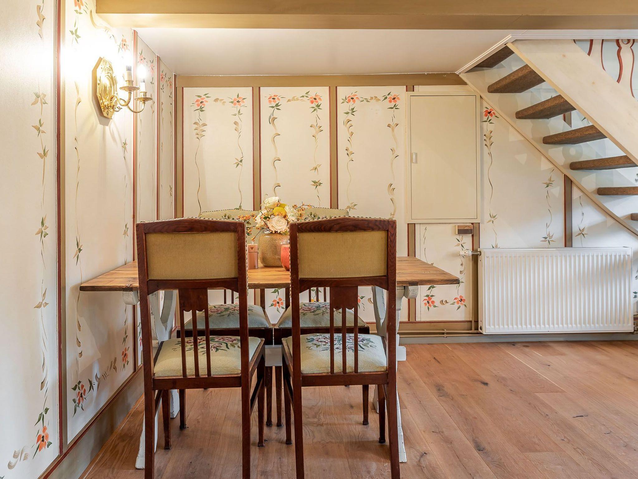 Auf zwei Etagen bietet unsere Ferienwohnung alles, was das Herz von vier Personen begehrt. Der rosafarbene Flur, die hellgelbe Decke und die 50 Jahre alten handbemalten Wandmalereien bieten den perfekten Mix aus Alt und Neu. Die farbenfrohe Einrichtung, verbunden mit dem alten Charme, sorgt für einen gemütlichen Aufenthalt. Auf der unteren Etage befindet sich ein geräumiges Bad mit Dusche, eine kleine Küche und der Wohnbereich. Dieser lädt mit seiner wohnlichen Atmosphäre zu gemeinsamen Stunden am Tisch oder auf der gemütlichen Sofalandschaft ein. Die obere Etage verfügt über zwei Schlafzimmer mit jeweils zwei Alkoven-Einzelbetten und ein weiteres WC.