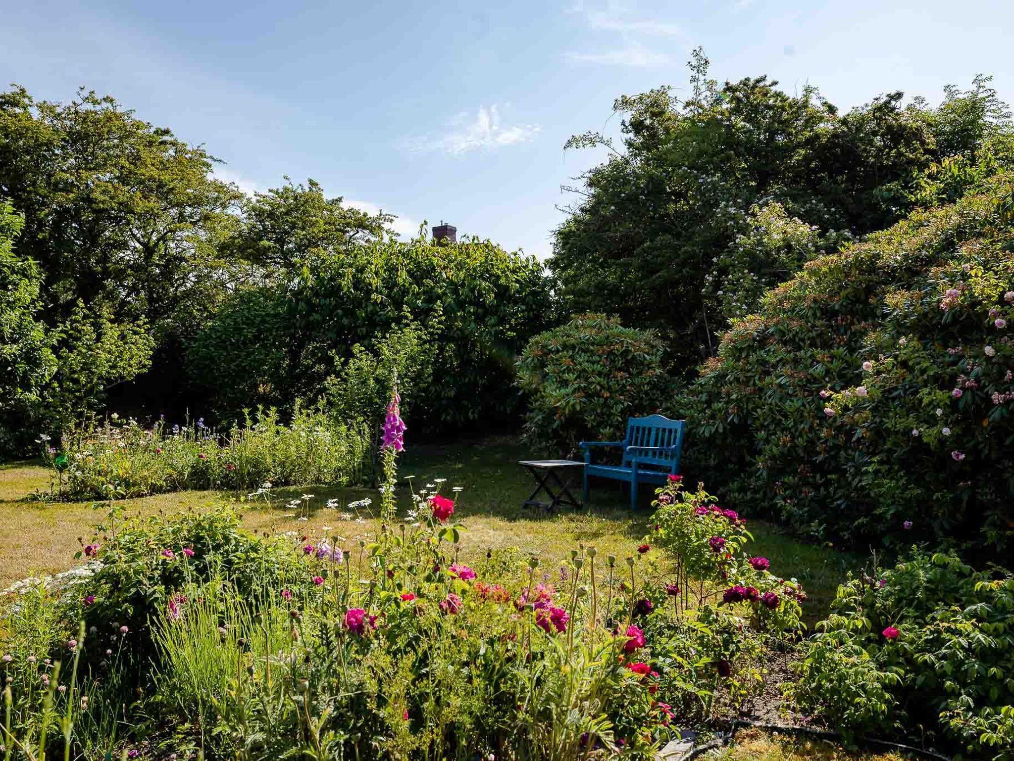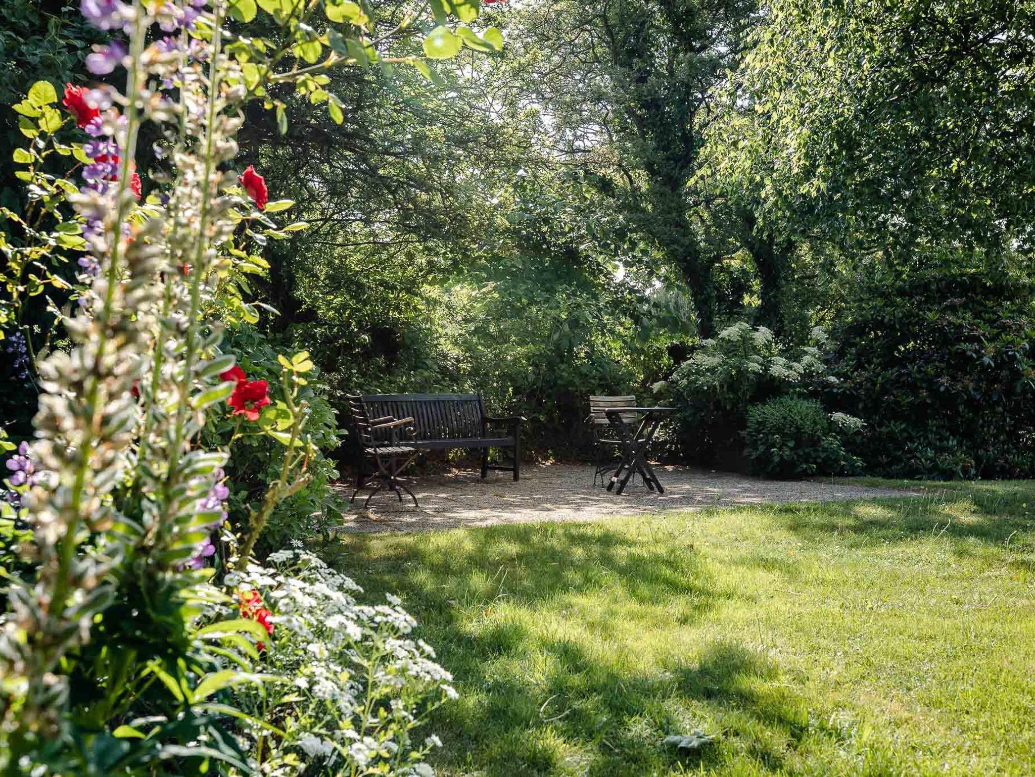 Ein Highlight ist definitiv der 3000 m² große Garten. Von der Ferienwohnung aus haben Sie direkten Zugang zu Ihrer eigenen Terrasse, von hier können Sie den Blick auf den gemeinschaftlichen Garten genießen. Der Garten bietet neben weiteren Sitzmöglichkeiten zum Sonnen ein Gartenhäuschen, in dem Sie die Waschmaschine oder den Trockner nutzen oder Ihre Fahrräder abstellen können. Außerdem finden Sie hier genug Platz zum Entspannen, nehmen Sie sich Ihr Lieblingsbuch und suchen Sie sich einen schönen Platz mitten in unserem Blumenmeer.