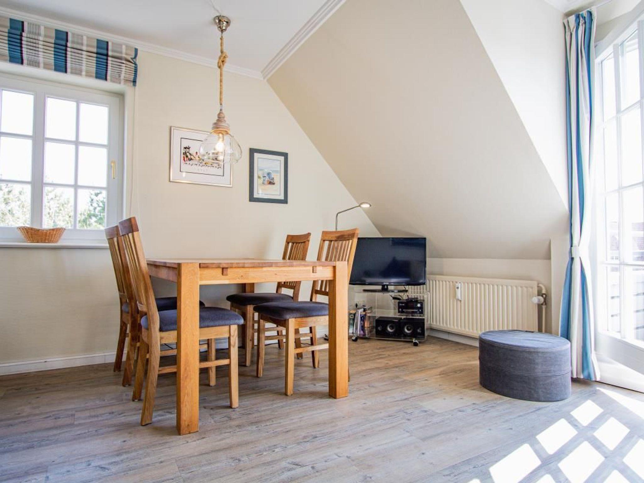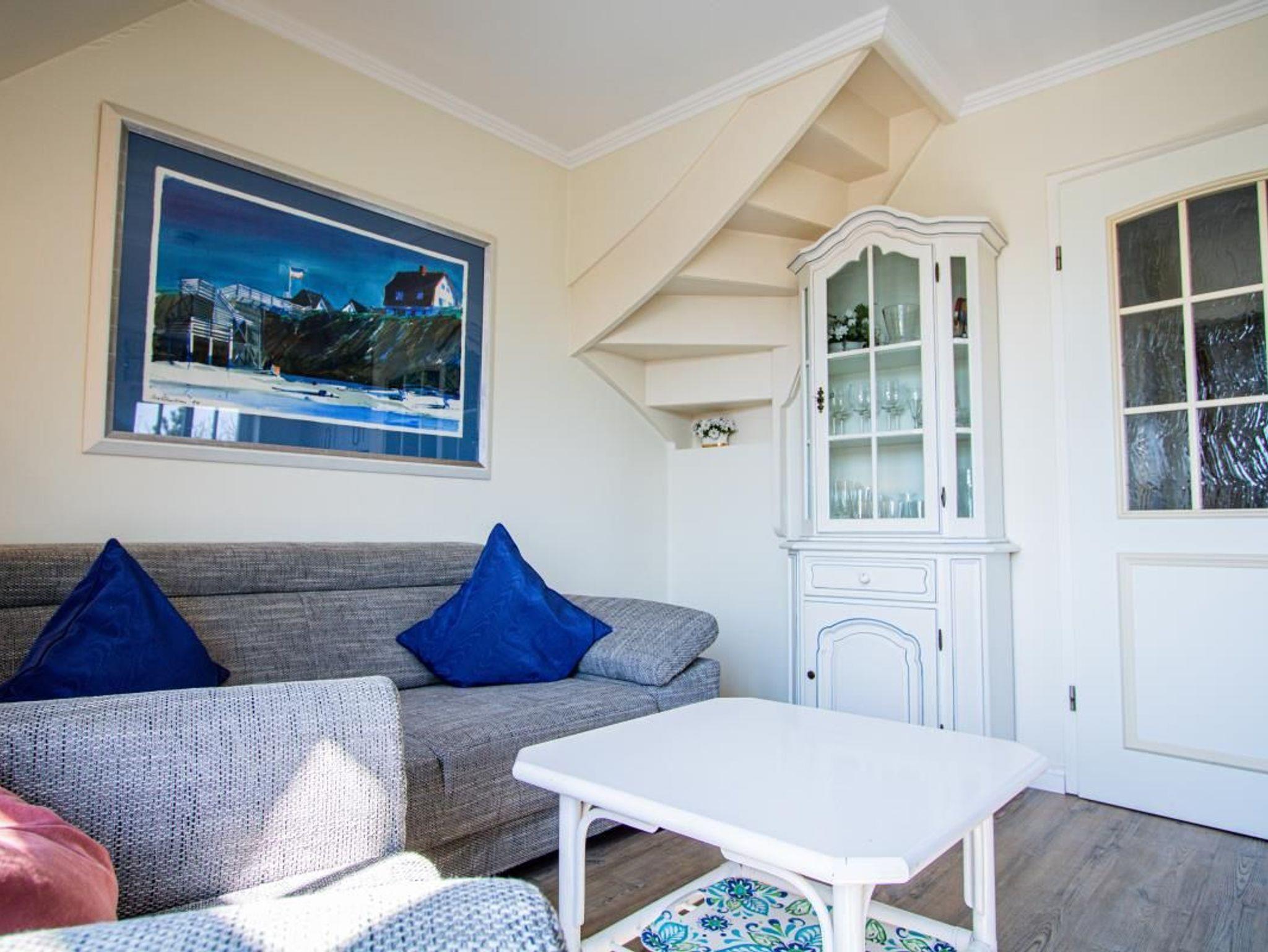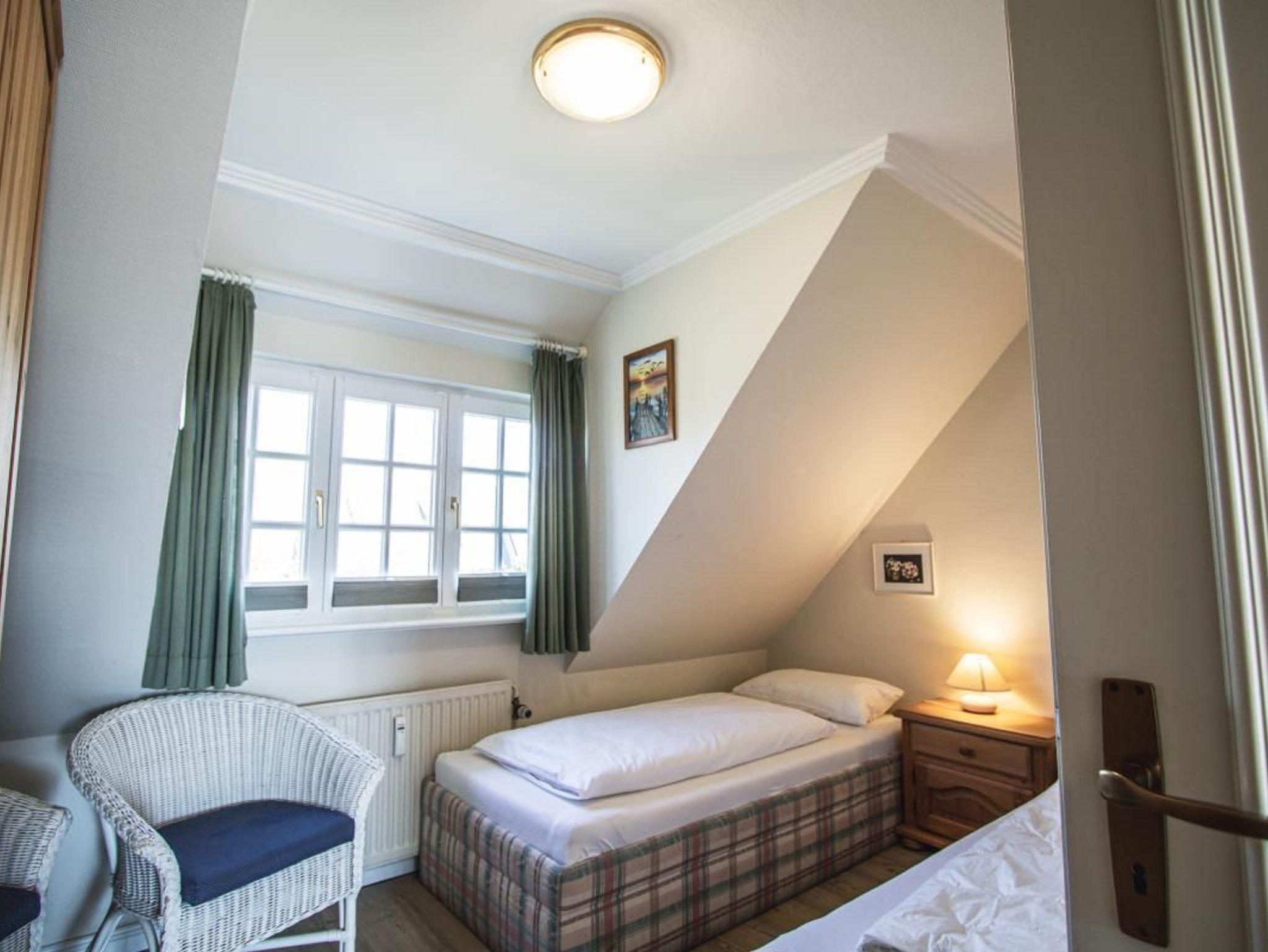 Das exclusive Obergeschoss Appartement liegt in einer Sackgasse, nur wenige Minuten bis zum Strand. Im OG der Wohn/Essbereich mit angrenzender Küchenzeile, ein neues Duschbad/WC und ein Doppelschlafzimmer. Ein weiterer Schlafzimmer mit 2 Einzelbetten ist im Dachgeschoss. Das Appartement hat Kabel-TV, Mini Anlage bzw. Radio,W-Lan, Geschirrspüler,einen Balkon zum Süden mit Gartenmöbeln, sowie eigene Sonnenkule mit Strandkorb,geschützt gelegen hinter dem Haus.
