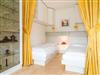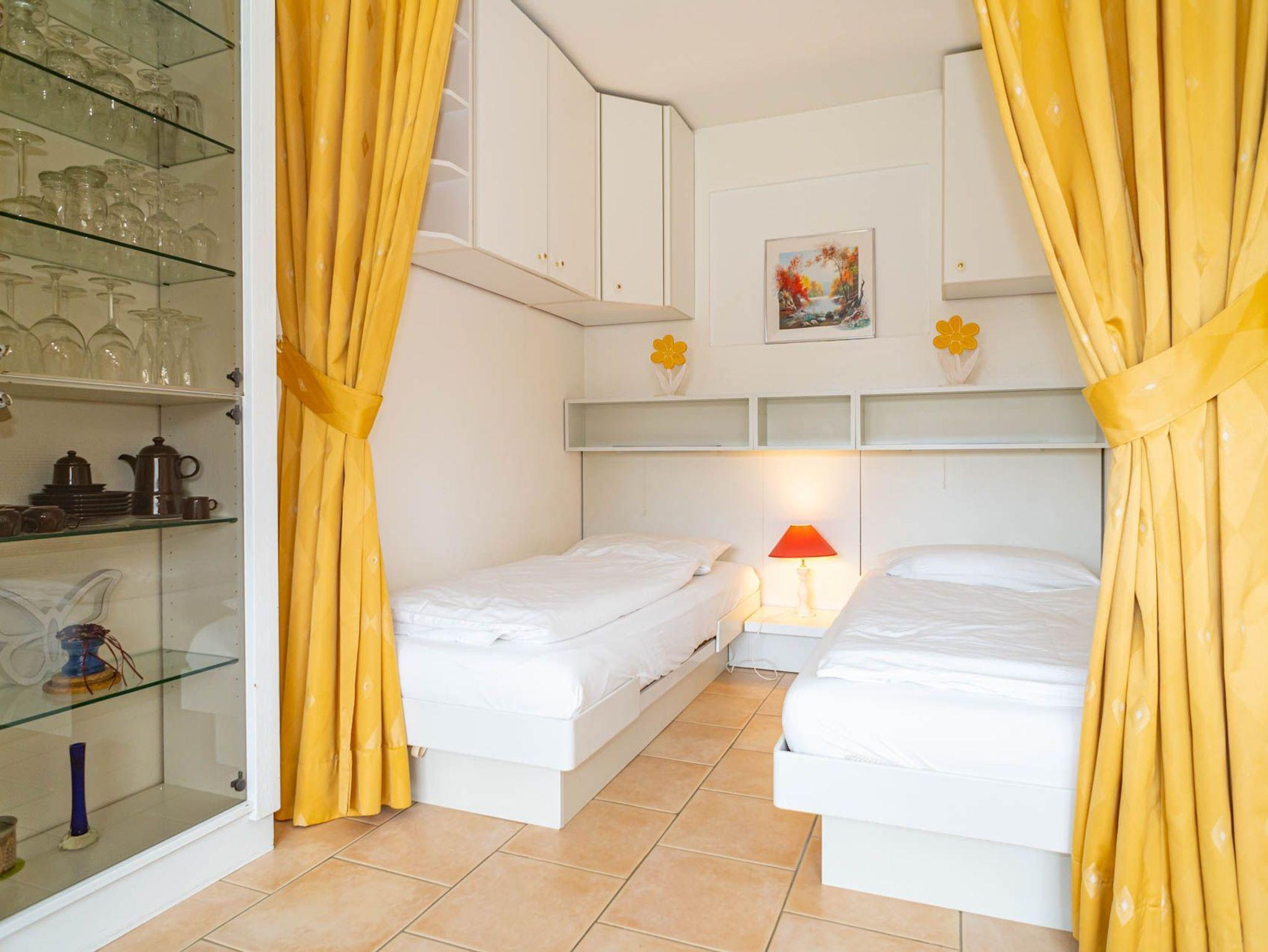 Die Schlafnische ist mit 2 Einzelbetten ausgestattet und kann durch einen Vorhang vom Wohnbereich getrennt werden.