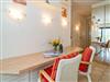 Die offene Küche hat einen Geschirrspüler, ein Ceranfeld mit zwei Kochfeldern und einen Kühlschrank. Kaffeemaschine, Wasserkocher und Toaster gehören zur Grundausstattung,