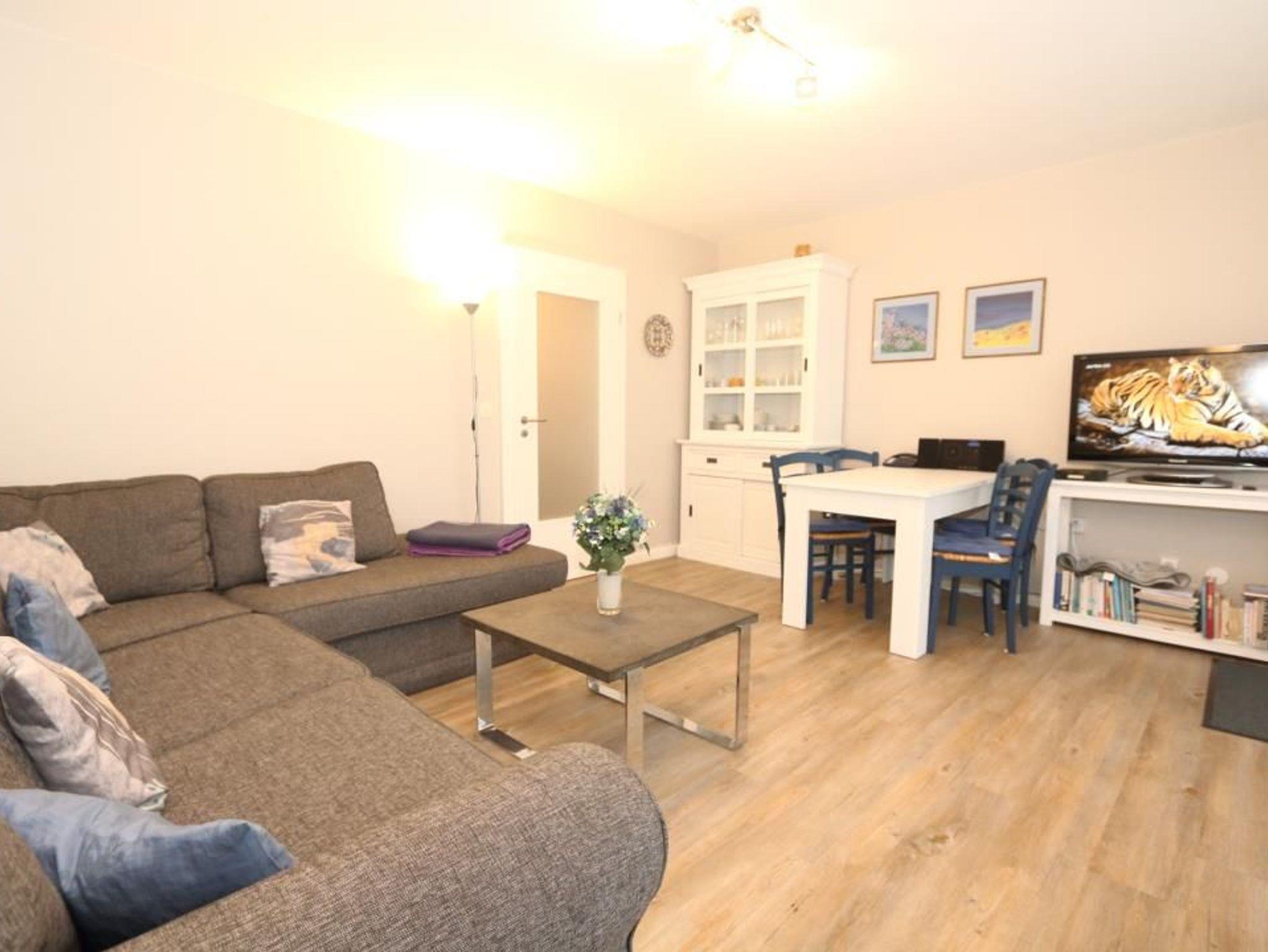Ein großzügiges Wohnzimmer in hellen Farben erwartet Sie. Bequeme Sitzgarnitur, Flachbildfernseher und Radio, W'Lan sowie Eßecke.
