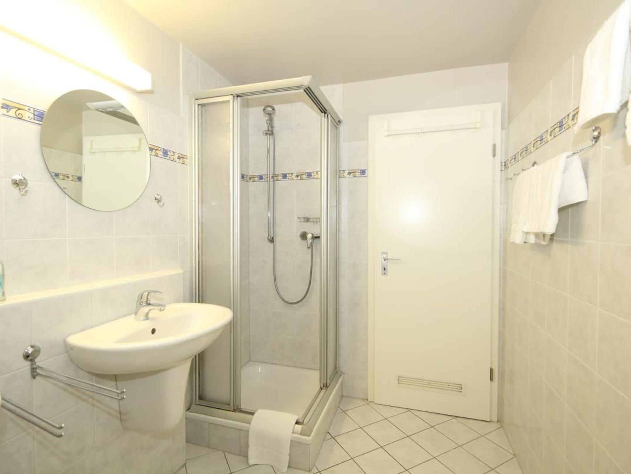Badezimmer mit Dusche, WC, Waschtisch. Ausreichend Handtücher und Vorleger.