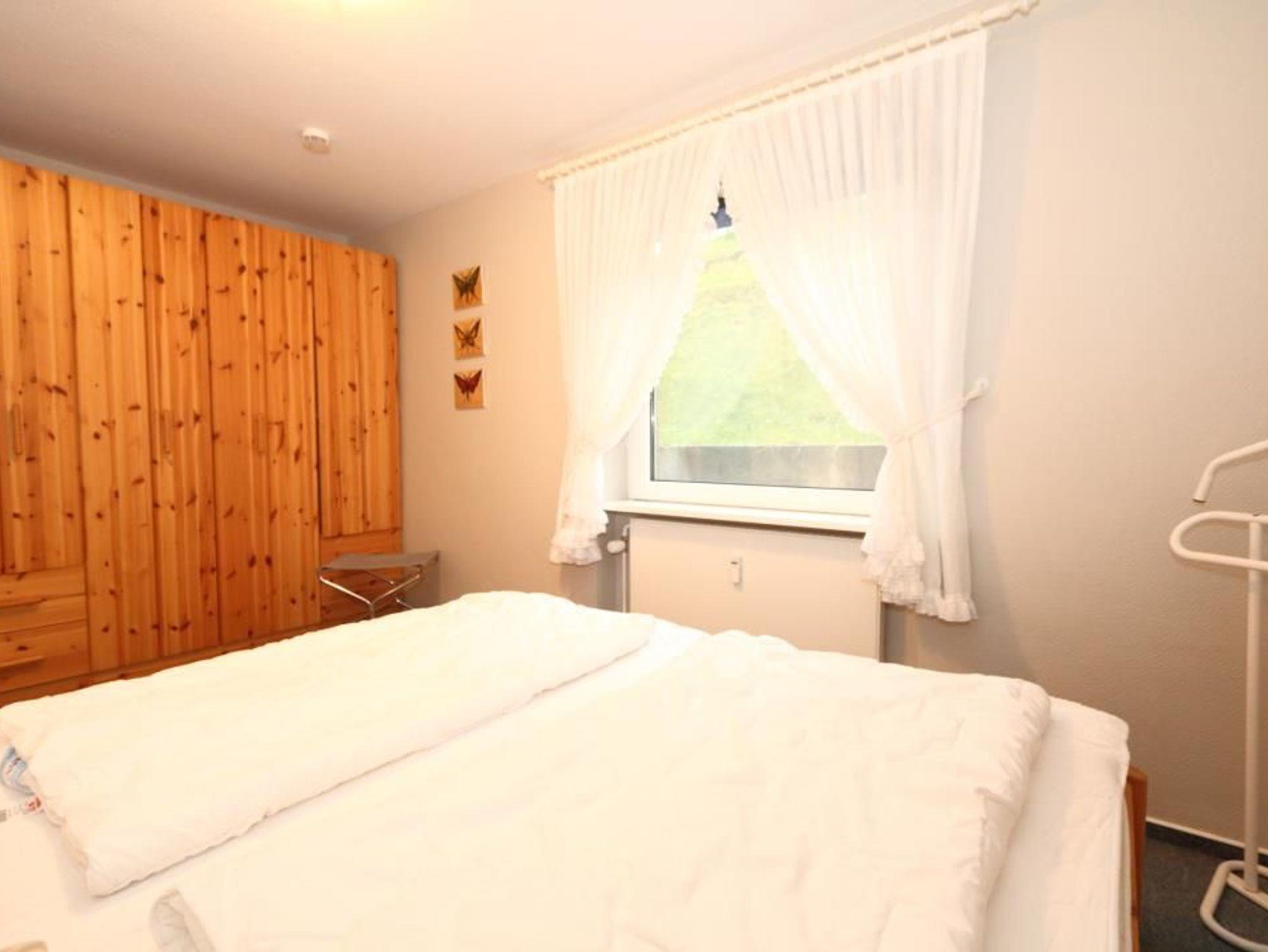Ein Schlafzimmer im Souterrain mit 1 großem Doppelbett, großer Kleiderschrank.