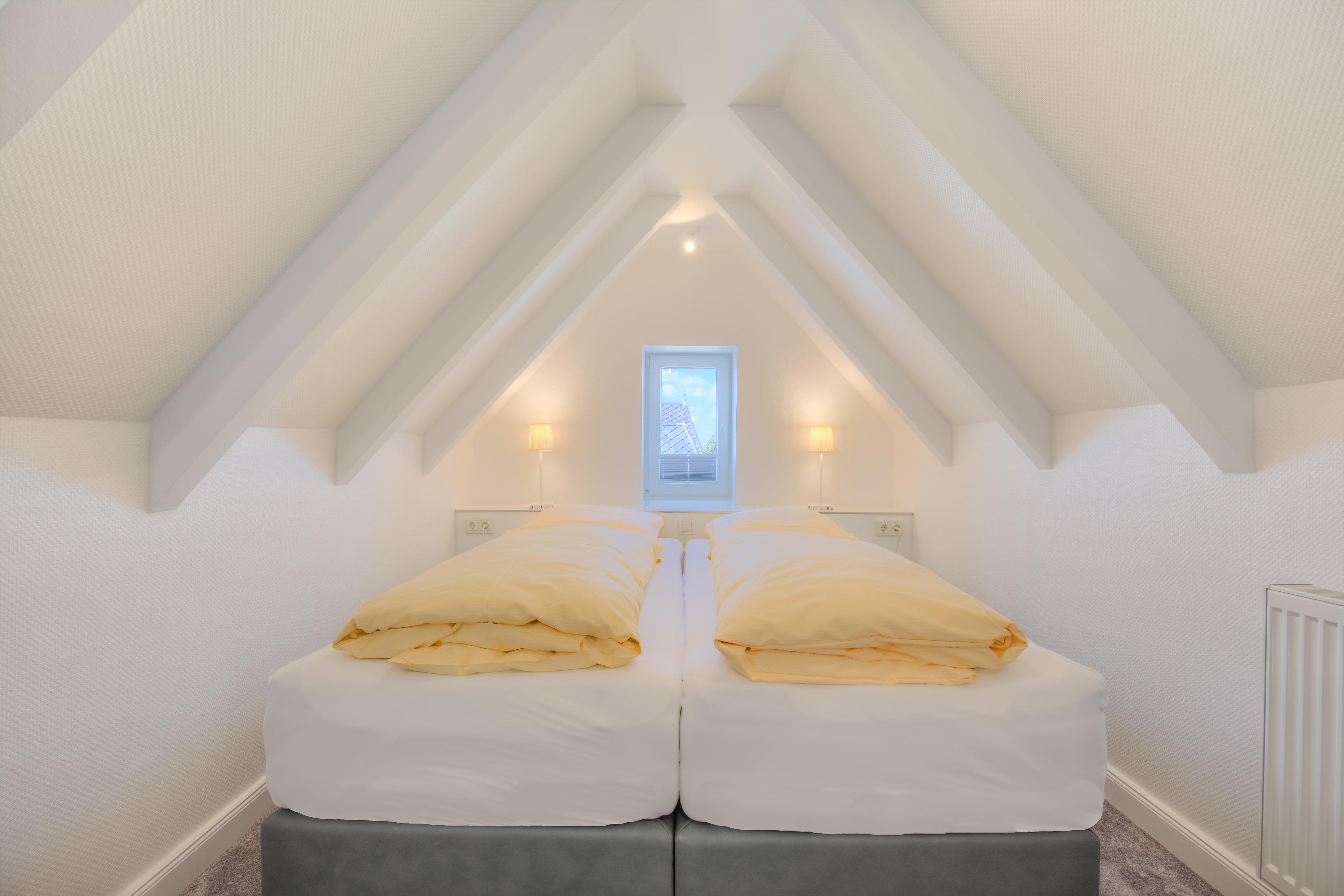 Über eine gut begehbare Treppe gelangen Sie vom Wohnzimmer in das gemütliche Schlafzimmer mit Boxspringbetten und Fernseher.