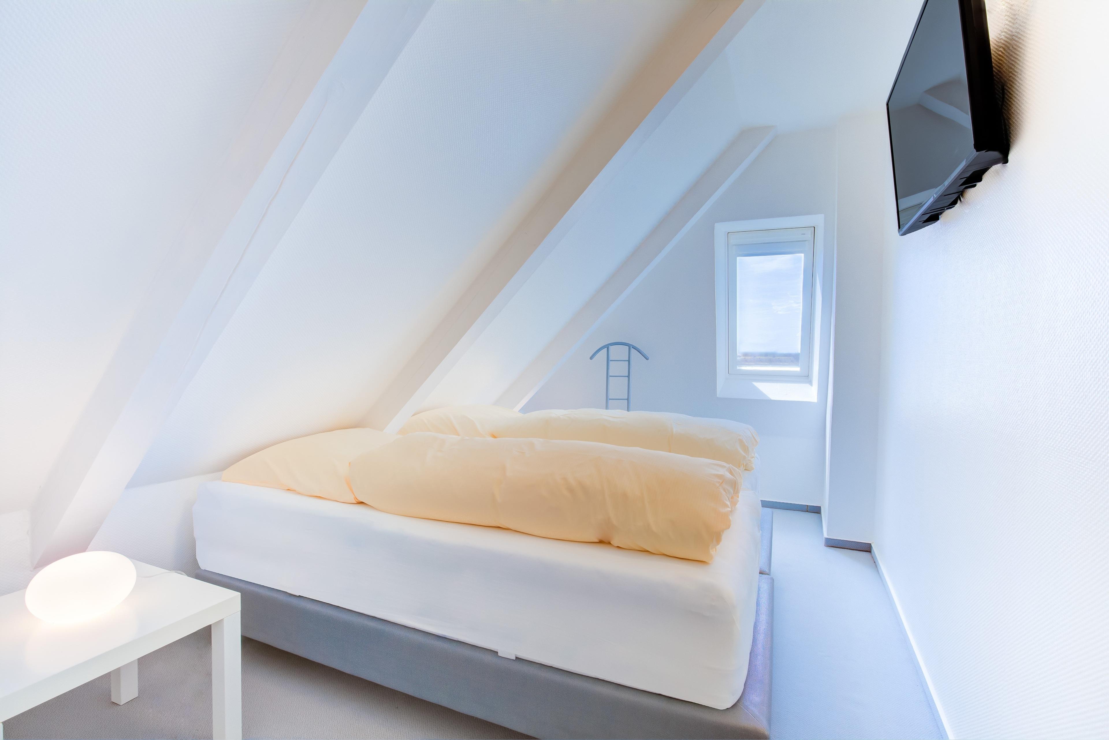 Im gemütlichen Schlafzimmer im Obergeschoss befinden sich ein Boxspringbett sowie ein weiterer Fernseher