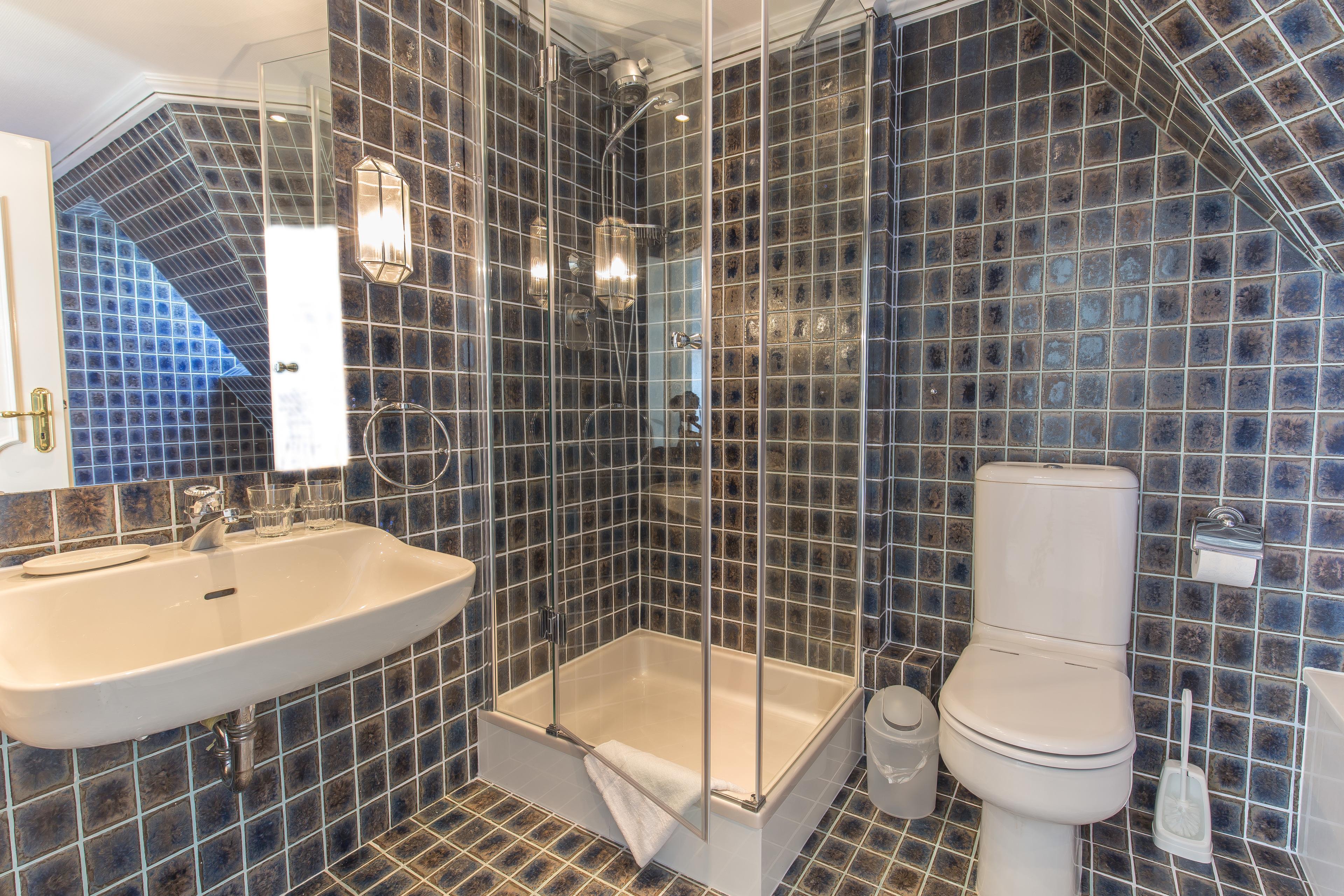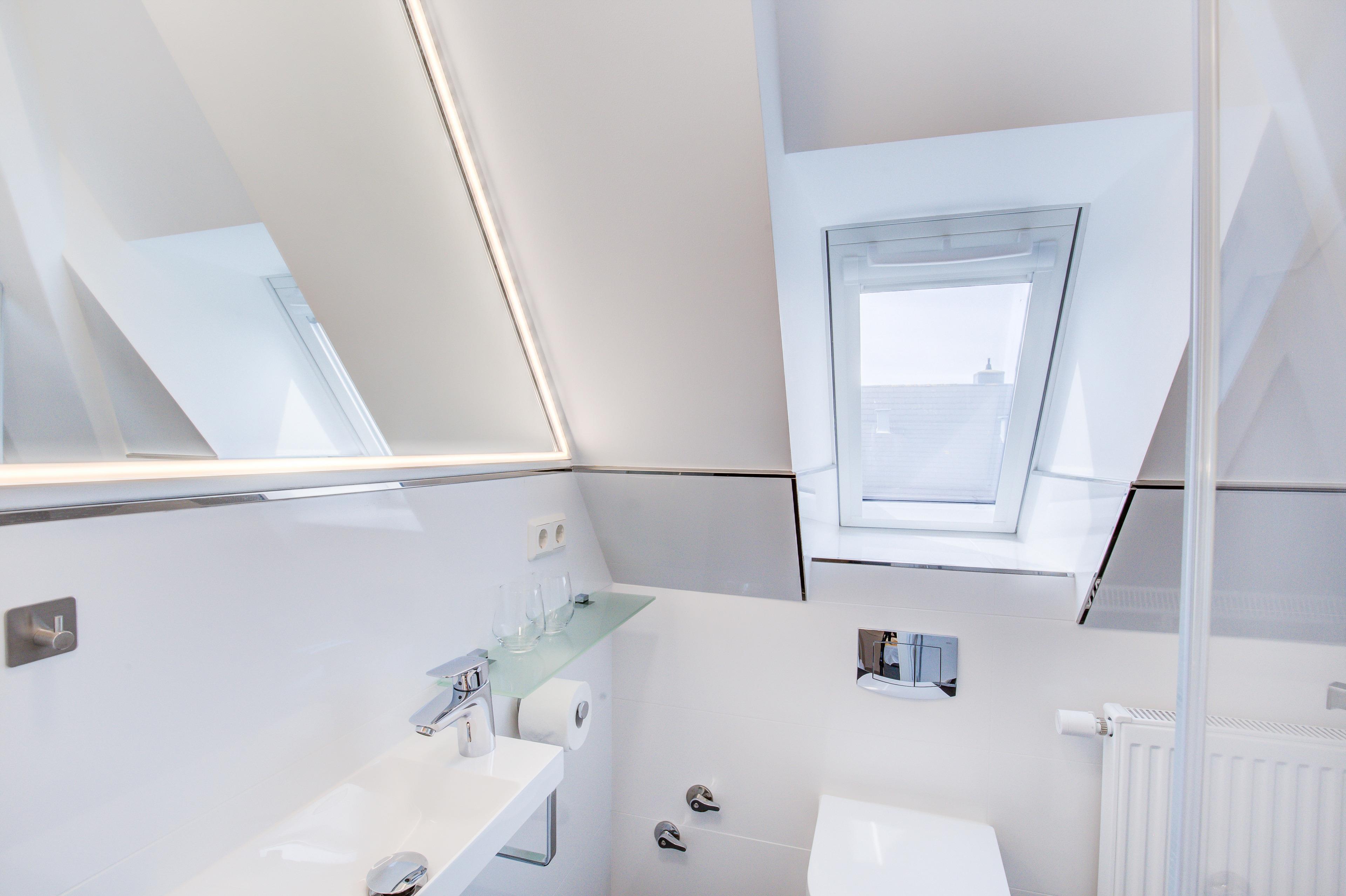 Jedem Schlafzimmer ist ein Duschbad zugeordnet. Dieser im Obergeschoss gelegenen Ferienwohnung ist auf der großen Gartenwiese eine eigene Terrasse mit Strandkorb und Gartenmöbeln zugeordnet
