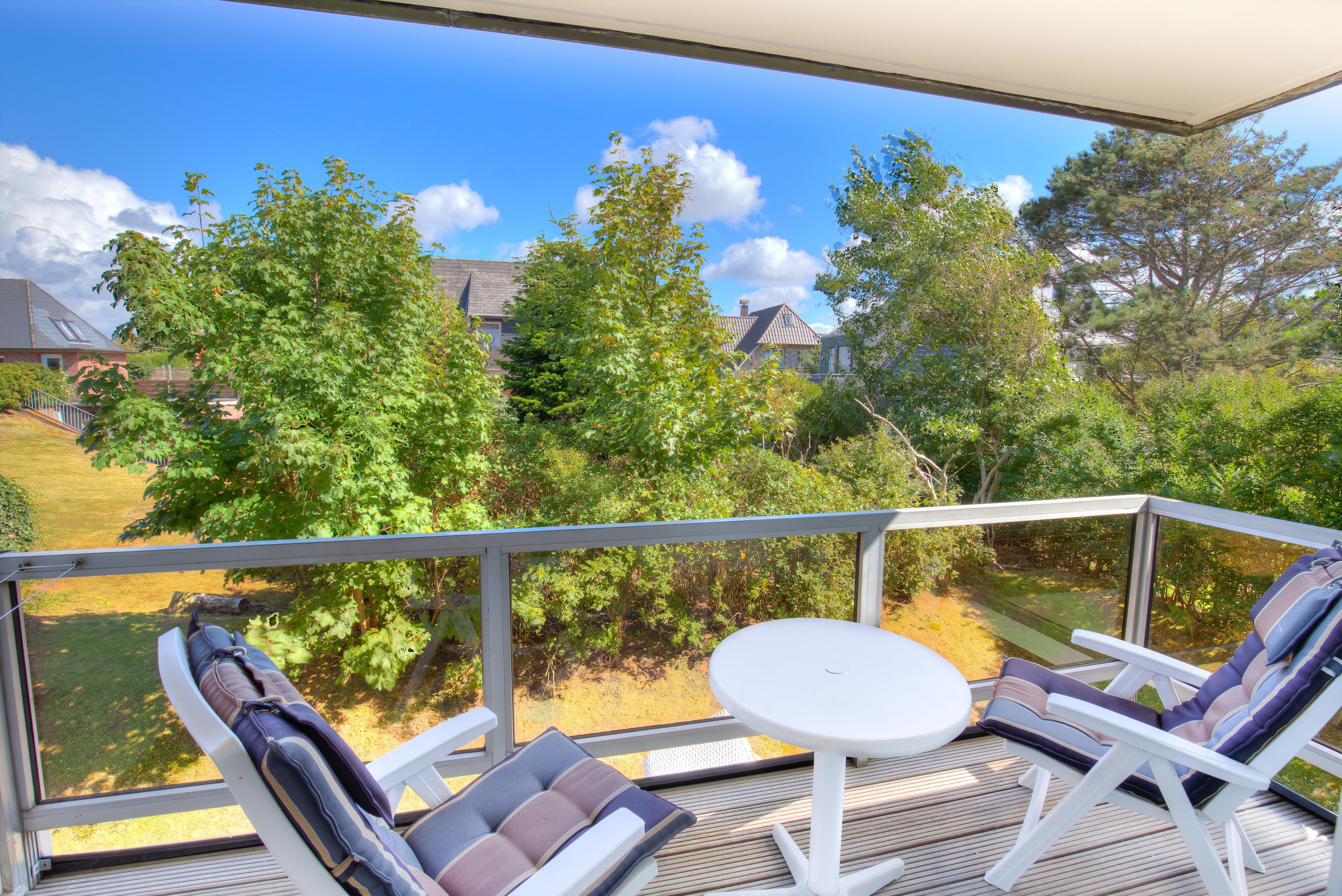 Vom Essplatz schauen Sie direkt auf den großen Ost-Balkon mit Gartenmöbeln.