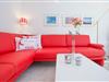 Moderne 2-Zimmer-Ferienwohnung mit großen Fensterelementen, Südterrasse mit Strandkorb.