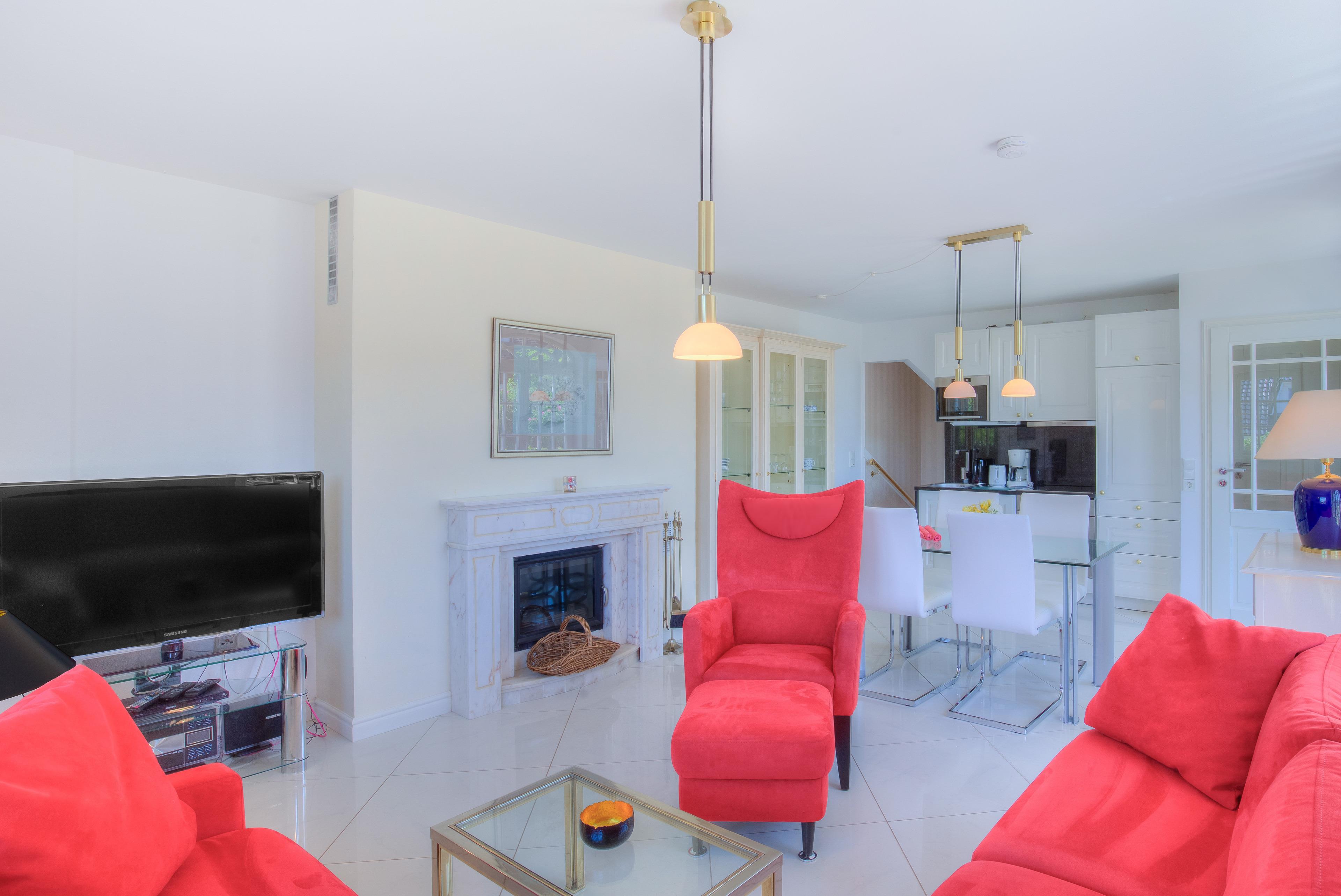 Im Erdgeschoss erwartet Sie ein großes Wohnzimmer mit großer Eckgarnitur, Marmorkamin, Essplatz und kompletter Küche mit Backofen, Mikrowelle und Geschirrspüler.