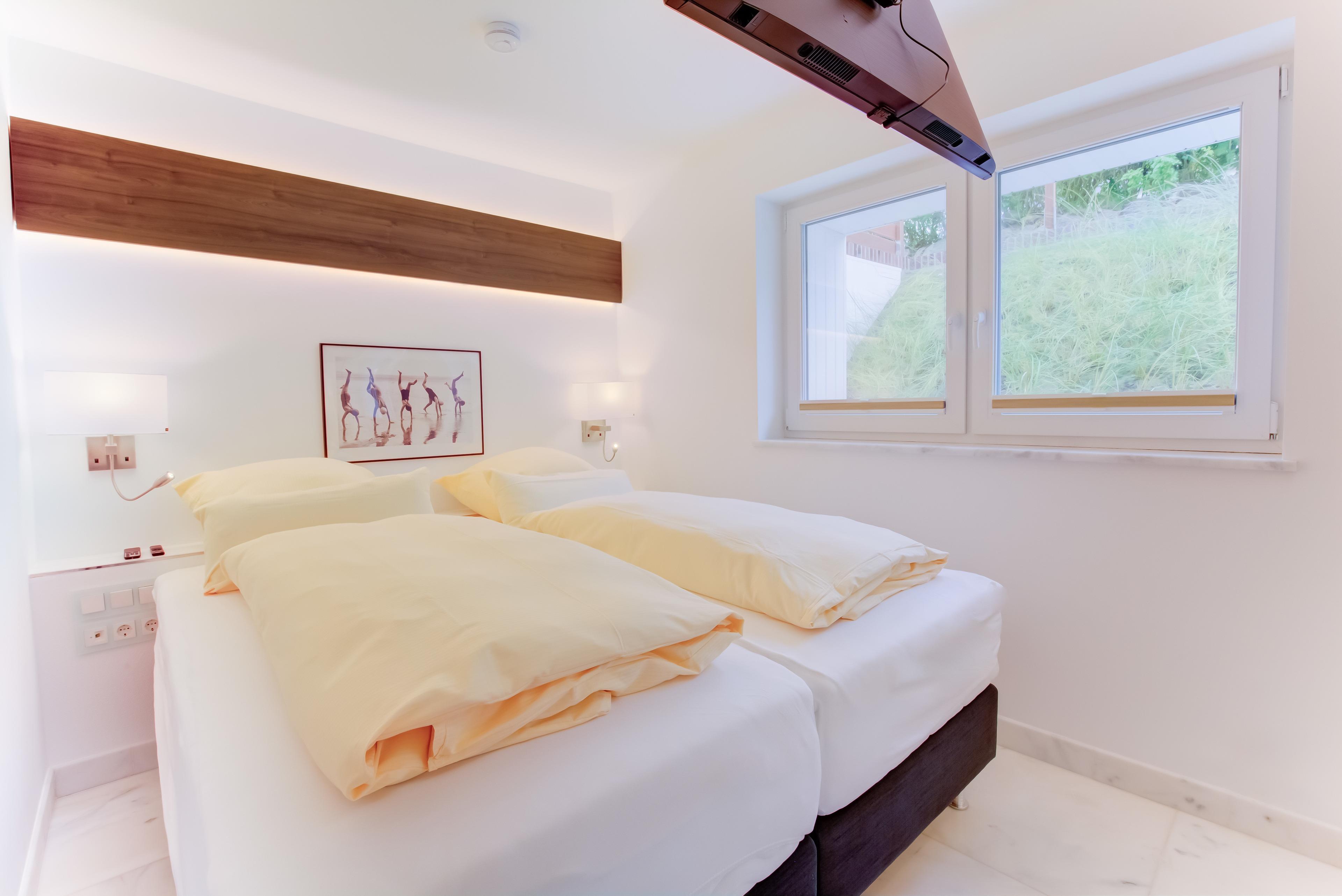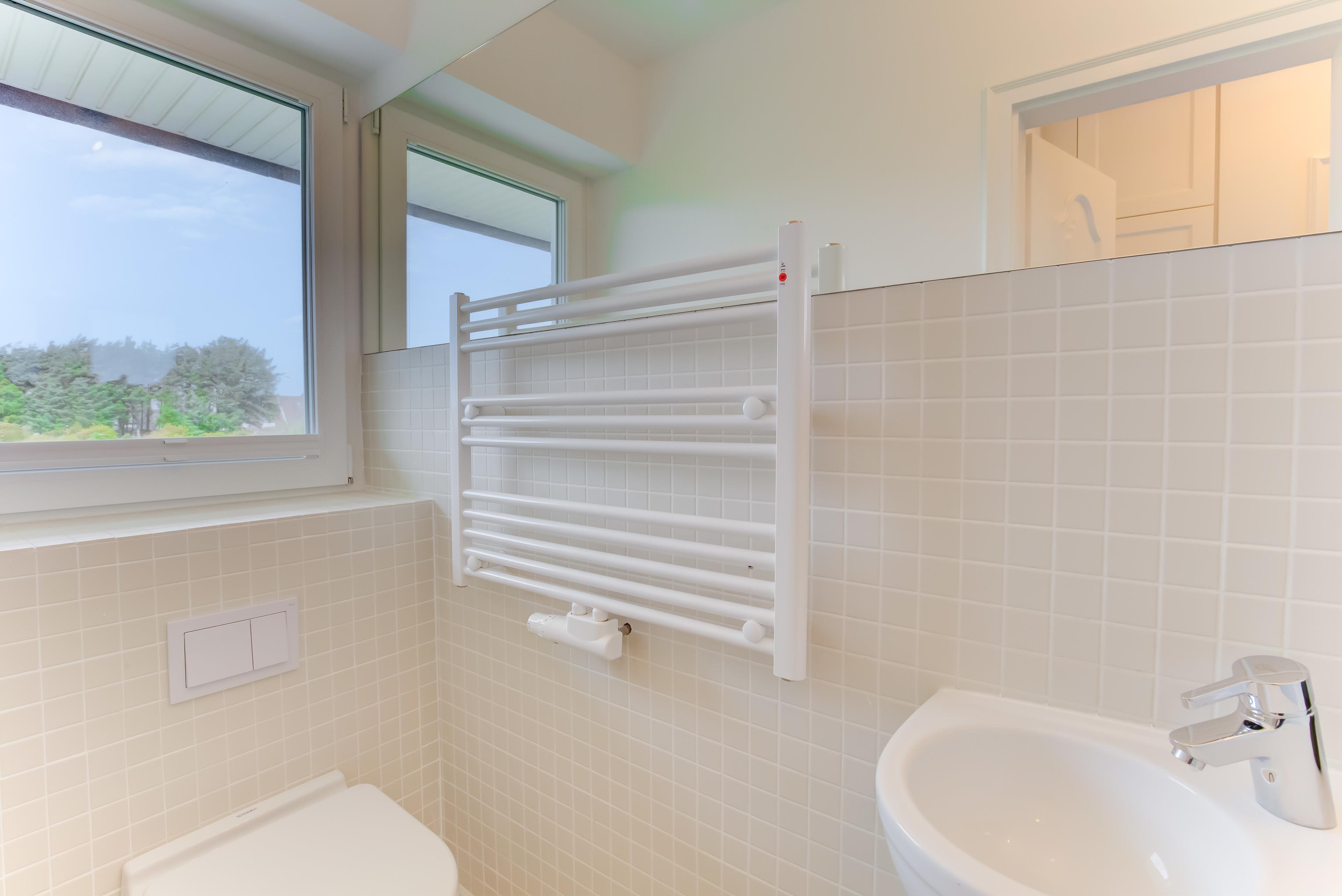Entdecken Sie am Rande einer naturgeschützten Heidefläche mit traumhaftem Meeresblick diese idyllische Wohnanlage mit der komfortabel eingerichteten Ferienwohnung "Haus am Meer – F3" auf 2 Ebenen und 80m² Wohnfläche. Einen fantastischen Blick über die Heidelandschaft können Sie von der schönen Südterrasse mit Strandkorb und Gartenmöbeln genießen. Im Erdgeschoss erwartet Sie ein ca. 25m² großer, lichtdurchfluteter Wohn-/Essbereich. Eine große, separate Küche mit Markengeräten und ein Gäste-WC ergänzen das EG. Im Untergeschoss der "Haus am Meer – F3" befinden sich die beiden Schlafzimmer mit Doppelboxspringbetten, welche jeweils über ein eigenes Duschbad verfügen.