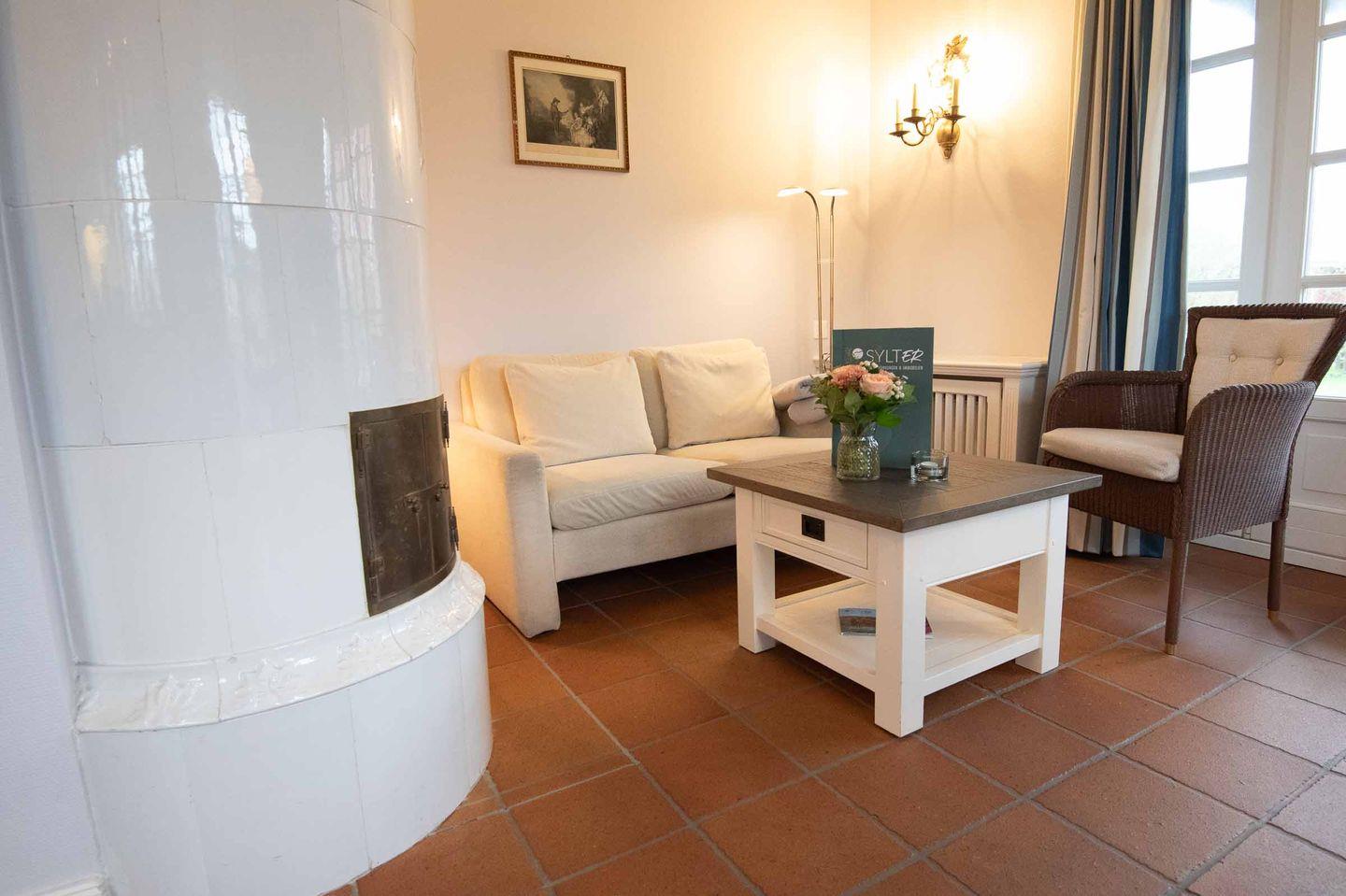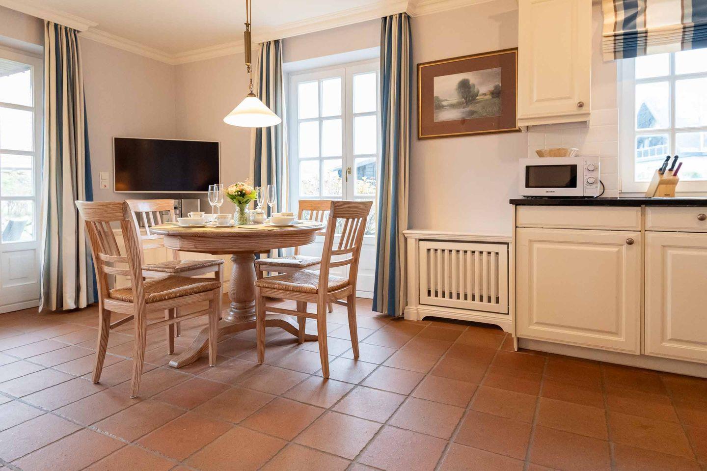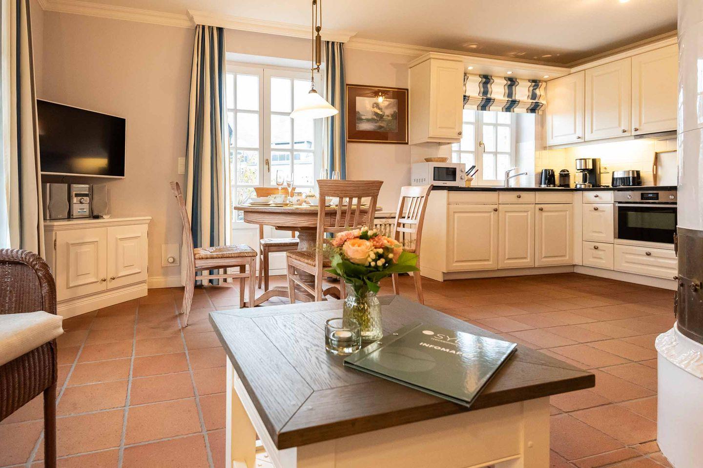Wohn-/Koch-/Essbereich: Zur Sonne ausgerichteter Wohn- und Essraum mit TV und schöner Einbauküche. Der Kachelofen wird Ihnen wohlige Wärme schenken. Vom Wohnzimmer geht es direkt in den großen Gartenanteil mit der möblierten Süd-West-Terrasse und einem Saison-Strandkorb.