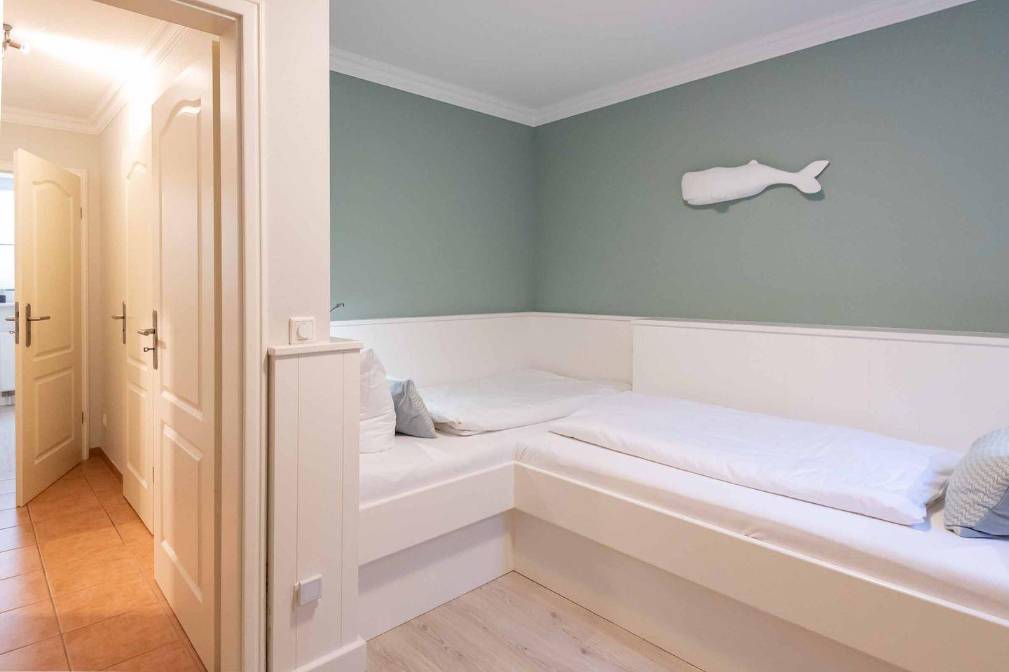 Schlafzimmer 2: Zwei Einzelbetten, TV und Fenster.