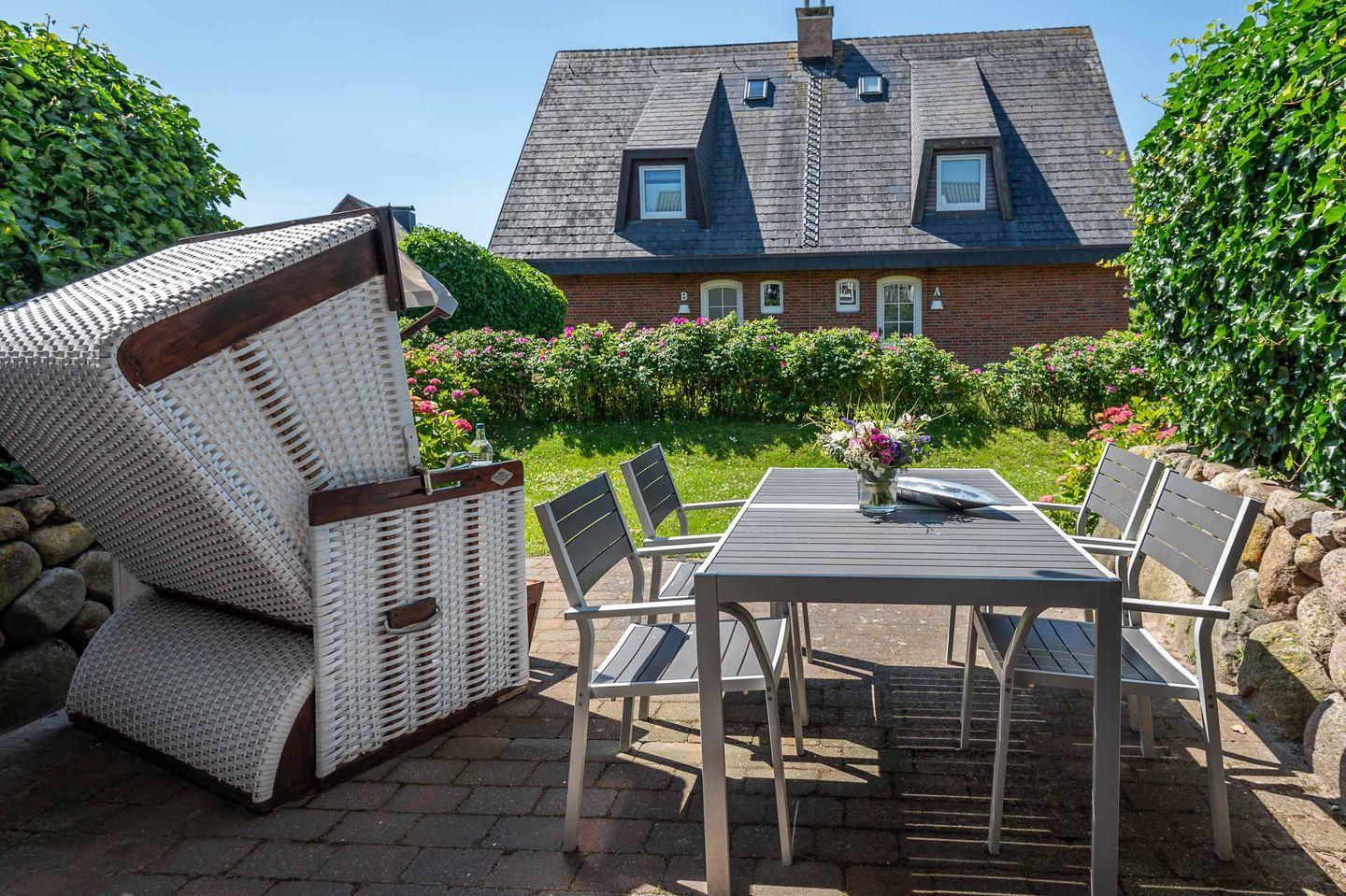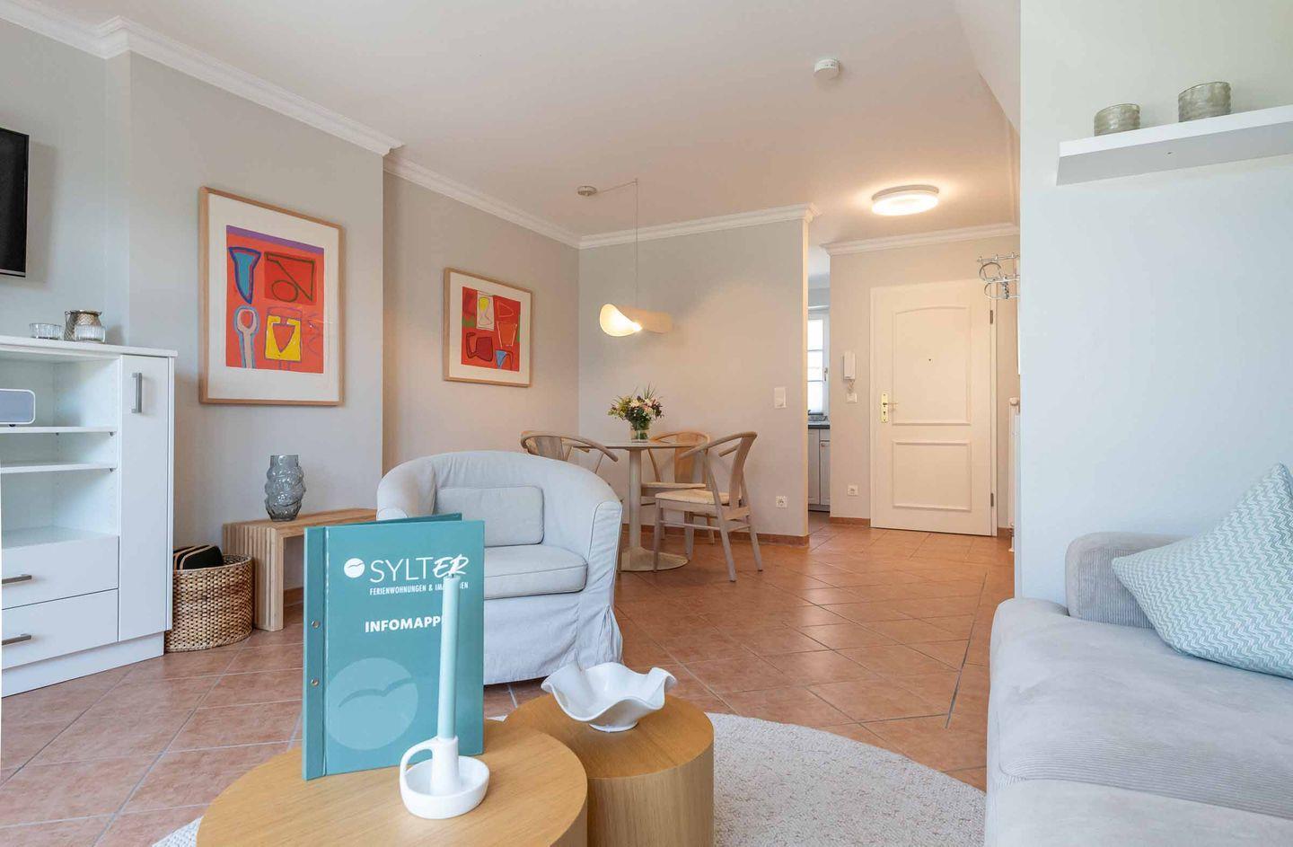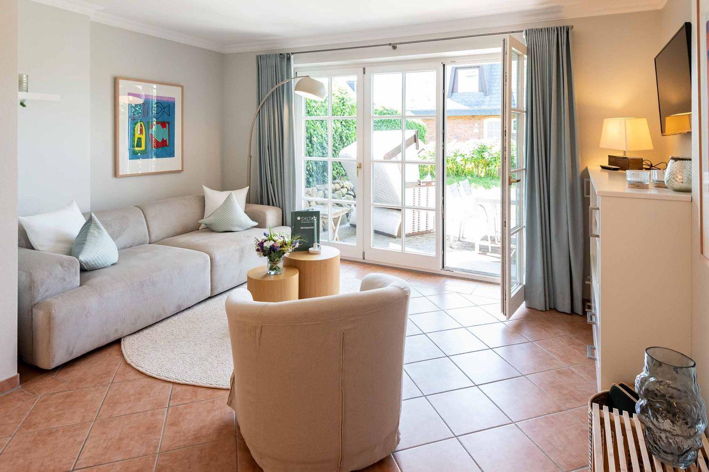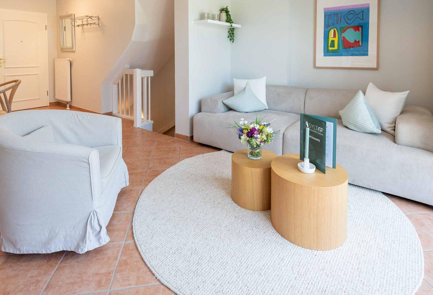 Wohn- und Essbereich: Der lichtdurchflutete und nach Süden orientierte Wohnraum mit Essbereich und gemütlicher Sitzecke, sowie TV, ist wie geschaffen für entspannte Urlaubsstunden. Vom hier gelangen Sie auch direkt auf die Terrasse, die mit schönen Gartenmöbeln und einem Saison-Strandkorb ausgestattet wurde.