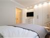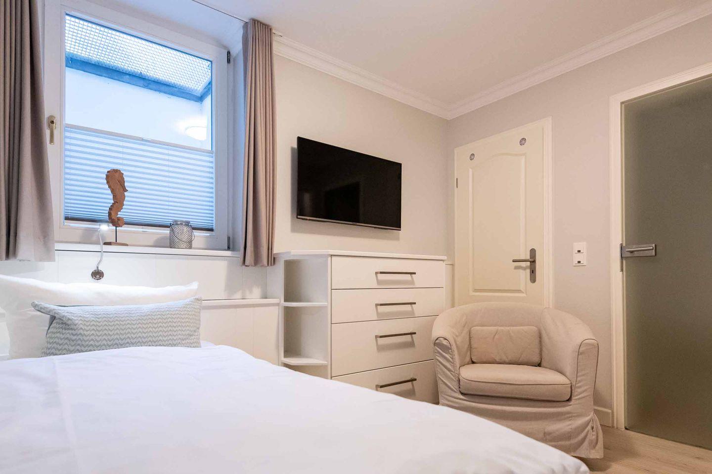 Schlafzimmer 1: Doppelbett, TV, edle Tischlereinbauten und Fenster.