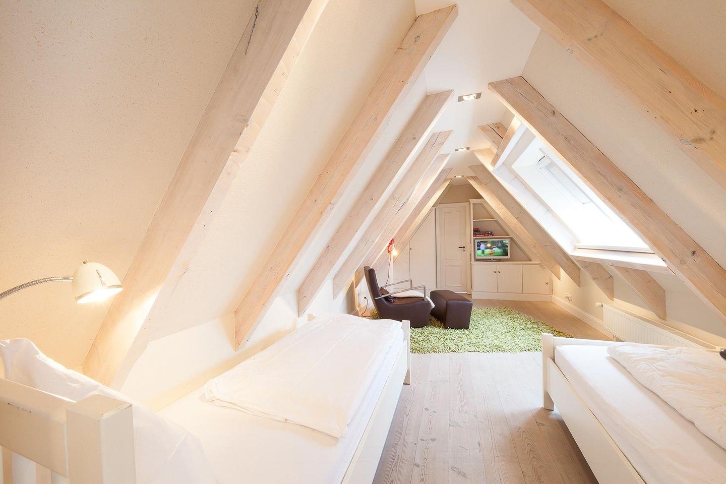 Schlafzimmer 2: Helles Schlafzimmer mit zwei Einzelbetten sowie Sitzmöglichkeit, TV und Fenster.