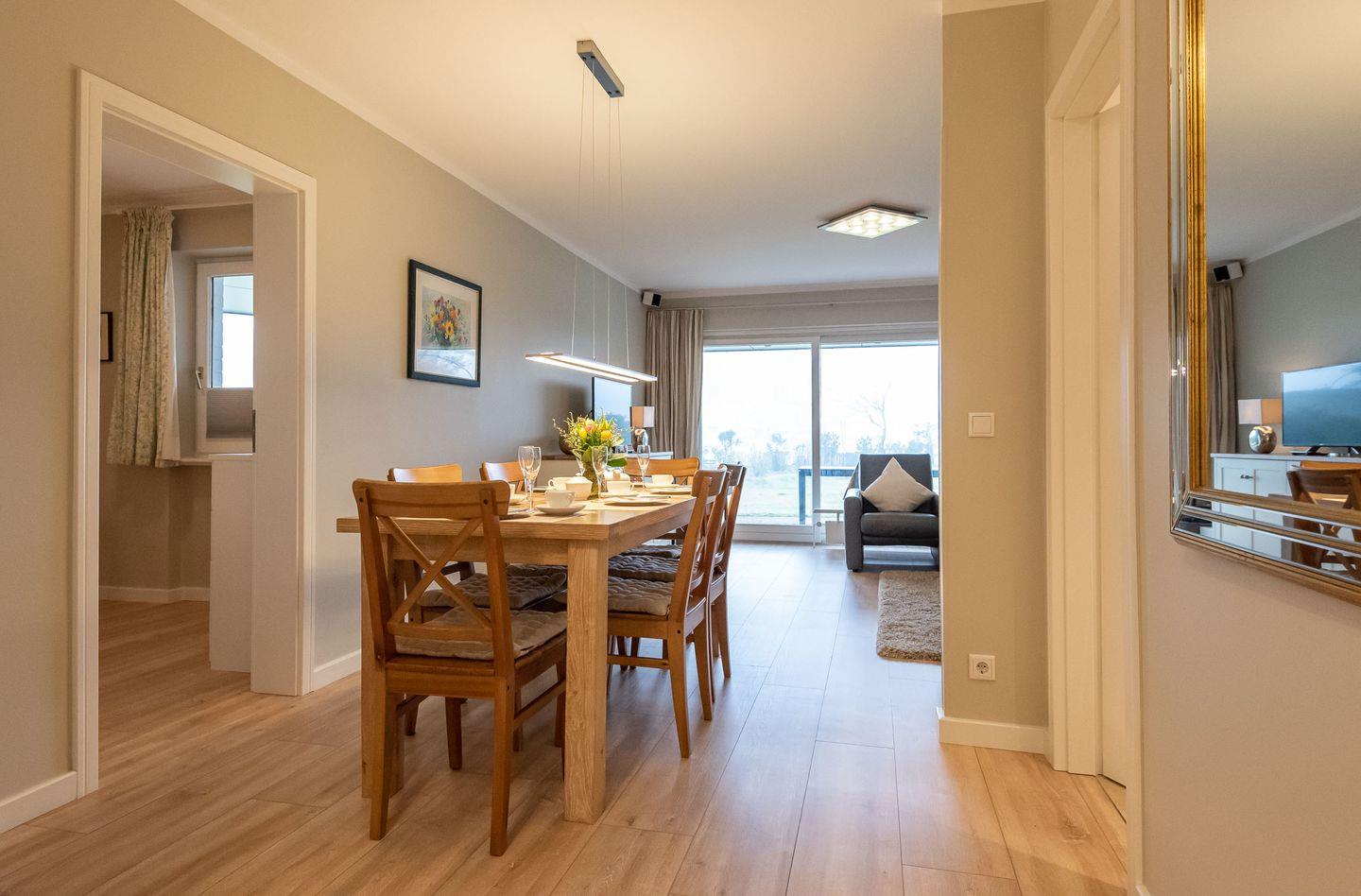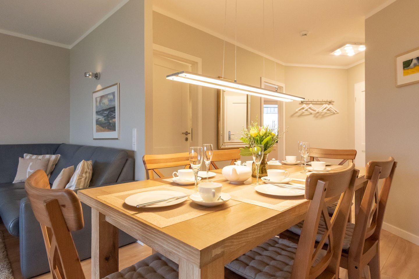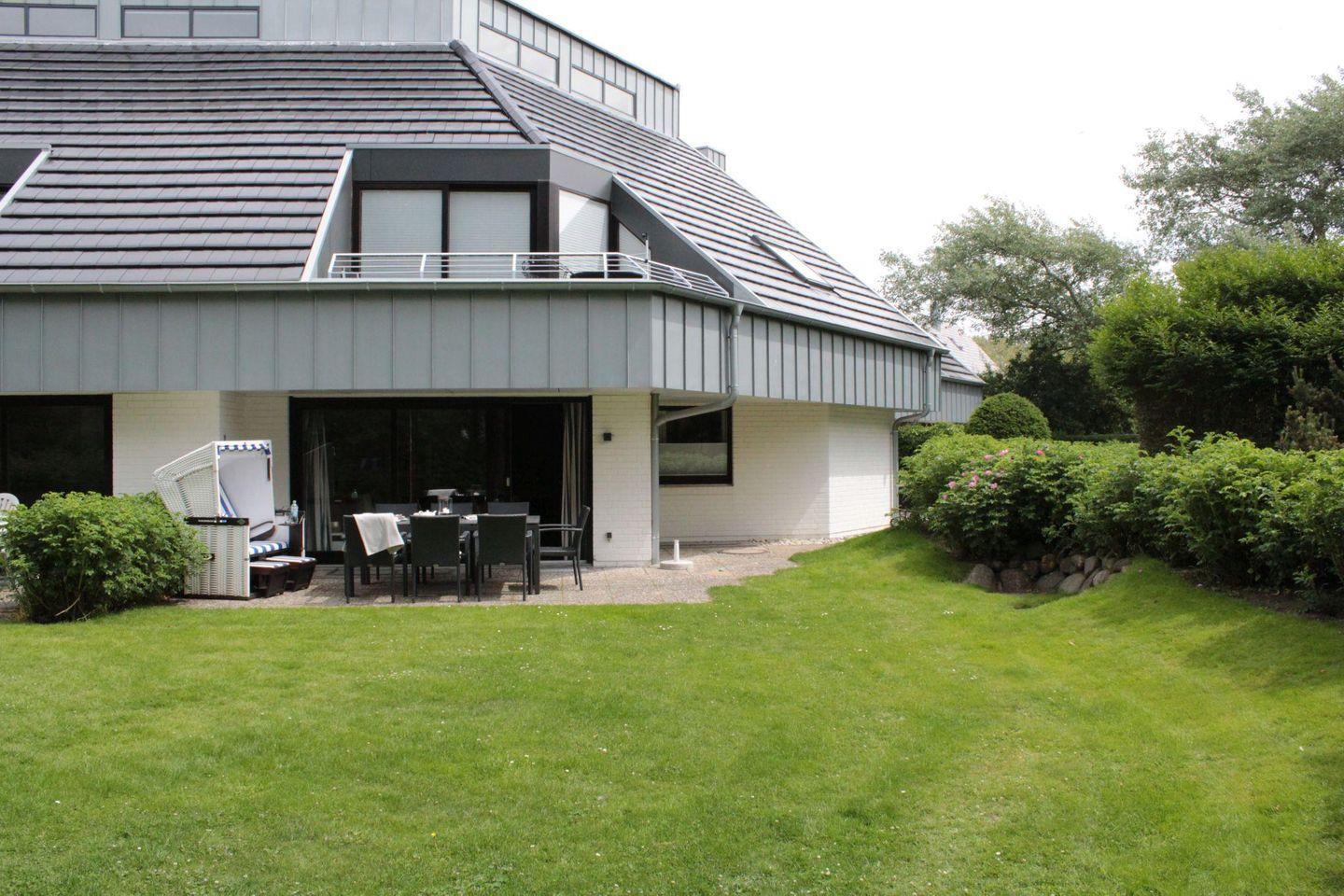 Vom Wohnbereich haben Sie Zugang zur sonnigen und ruhigen Süd-West-Terrasse mit Gartenmöbeln und Saison-Strandkorb.