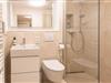 Drei helle und moderne Duschbäder mit bodentiefen Duschen, WC und Handtuchhalter. Eines der drei Badezimmer verfügt über eine Dampfdusche und eine Waschmaschine.