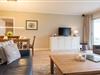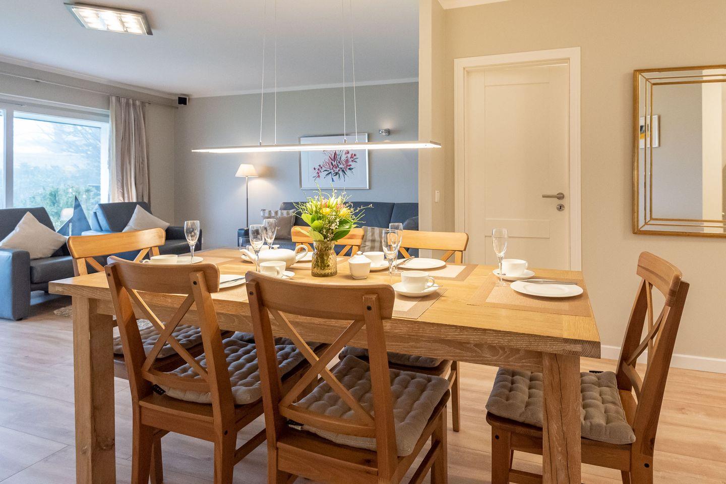 Separate und moderne Küche mit erstklassiger Ausstattung und Fenster. Im Wohnzimmer befindet sich eine große und bequeme Sitzlandschaft, die ausreichend Platz für 7 Personen bietet. Gleiches gilt für den einladenden Essbereich. Helle Möbel und ein großer TV sorgen für Wohlfühlatmosphäre. Von hier aus gelangen Sie direkt auf die möblierte Terrasse und in den Garten.