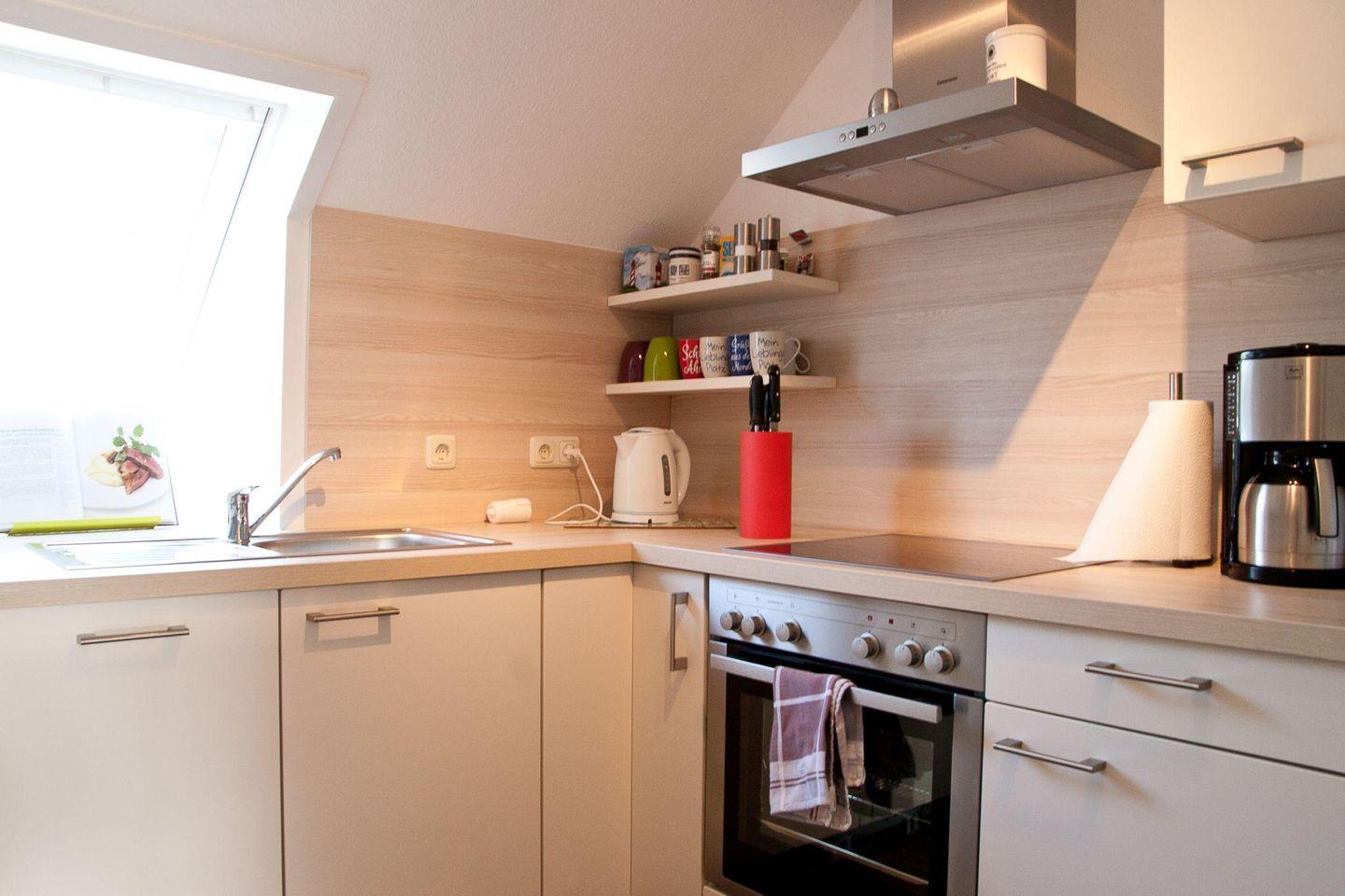 Küche: Die moderne Einbauküche ist ausgestattet mit Ceran-Kochfeld, Umluftbackofen, Spülmaschine und Waschmaschine.
