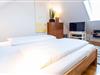 Schlafzimmer 2: Doppelbett, Parkettboden, Schränke, TV und Fenster.