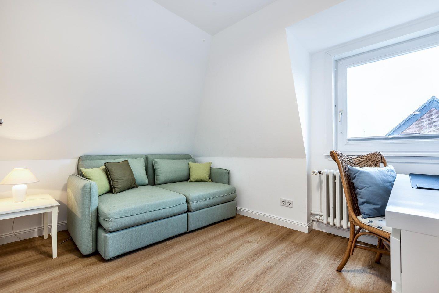 Schlaf-/Arbeitszimmer: Schlafsofa (1,60 x 2m) und Schreibtisch.