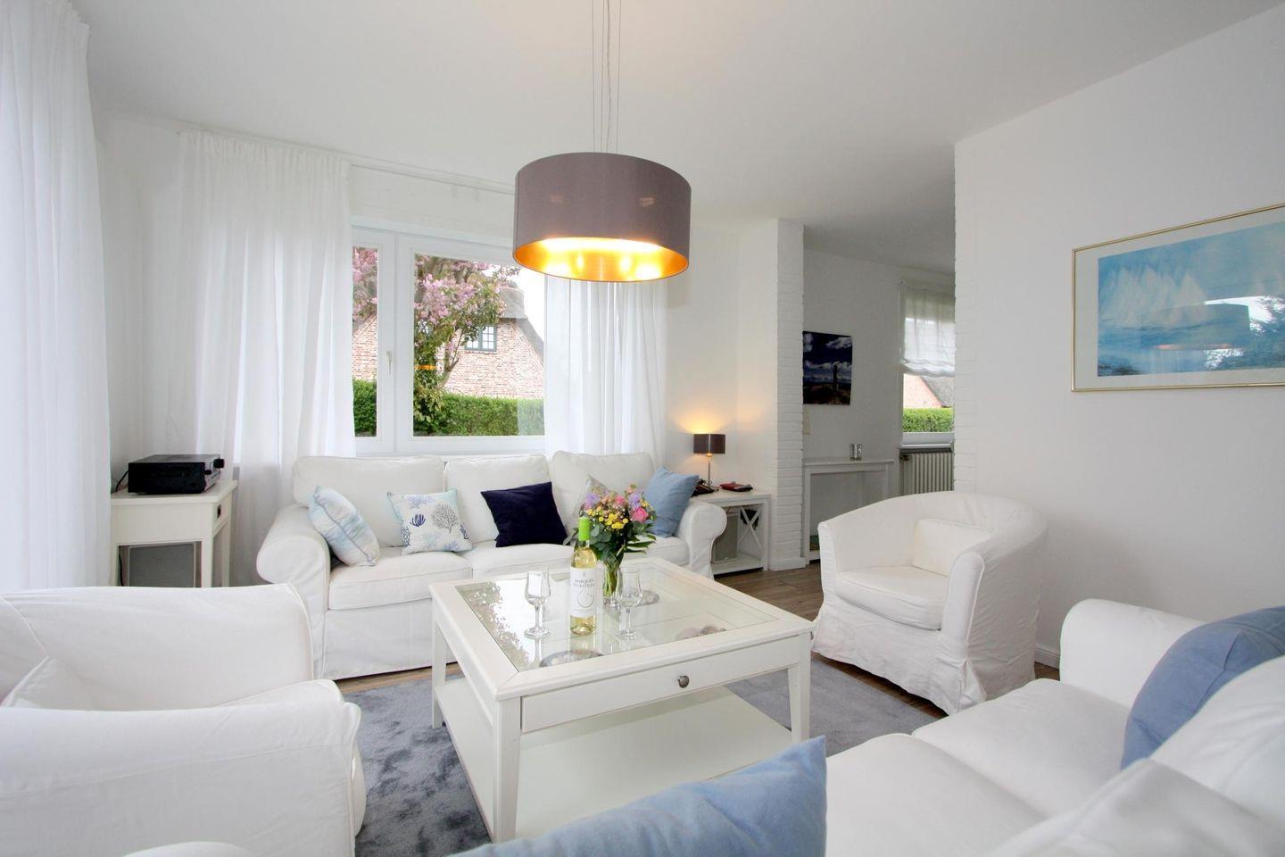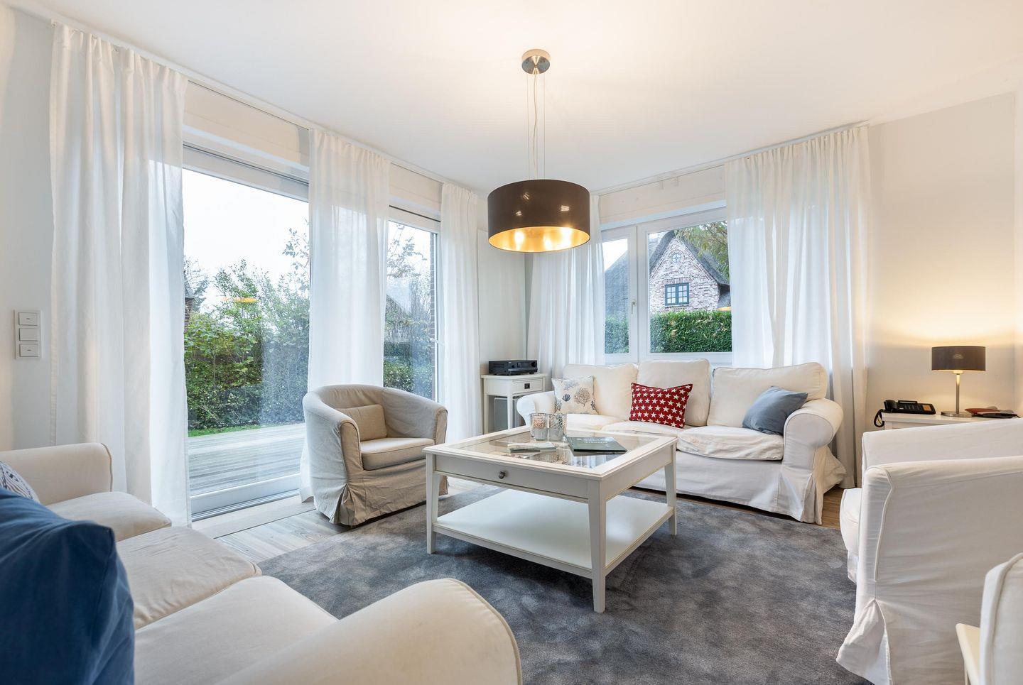 Wohnzimmer: Großer Wohnbereich mit separatem Fernsehzimmer. Zugang zur Terrasse und zum Garten, der mit zwei Saison-Strandkörben und hochwertigen Gartenmöbeln ausgestattet wurde.