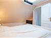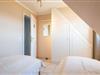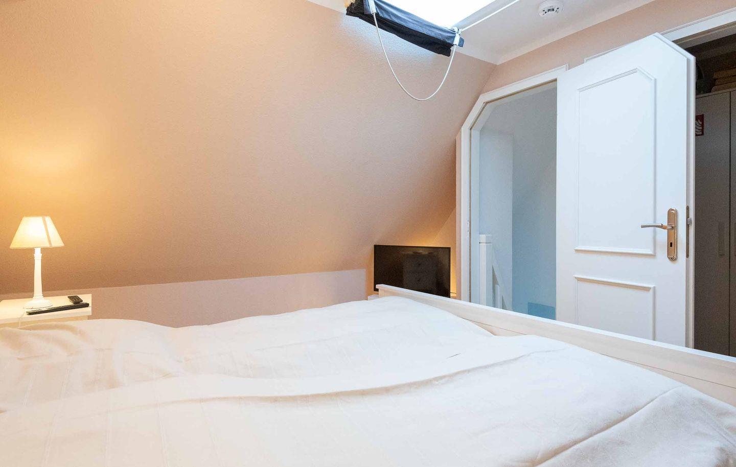 Schlafzimmer 2: Modernes Doppelbett, verdunkelbare Oberlichter im Dachfirst und ein begehbarer Kleiderschrank.