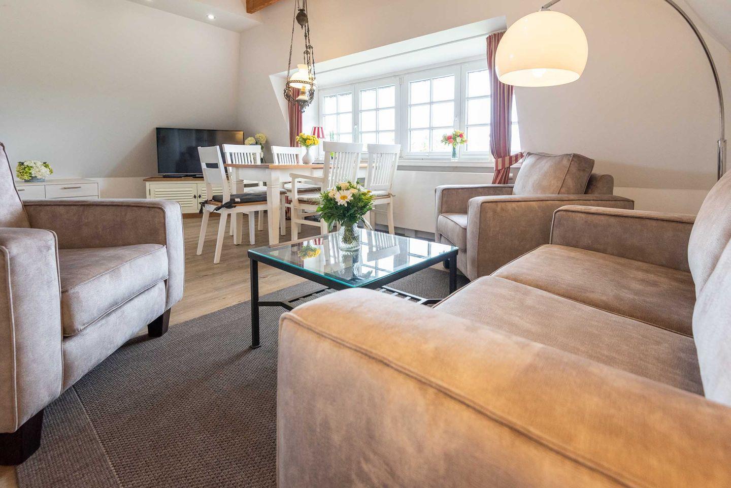 Sylturlaub auf einem herrlichen Reetdachanwesen erleben hier bis zu 4 Personen. Die ruhige Dreizimmerwohnung mit 60 m² Wohnraum in einem idyllischen Landhaus kombiniert ländliches Ambiente mit moderner Technik.