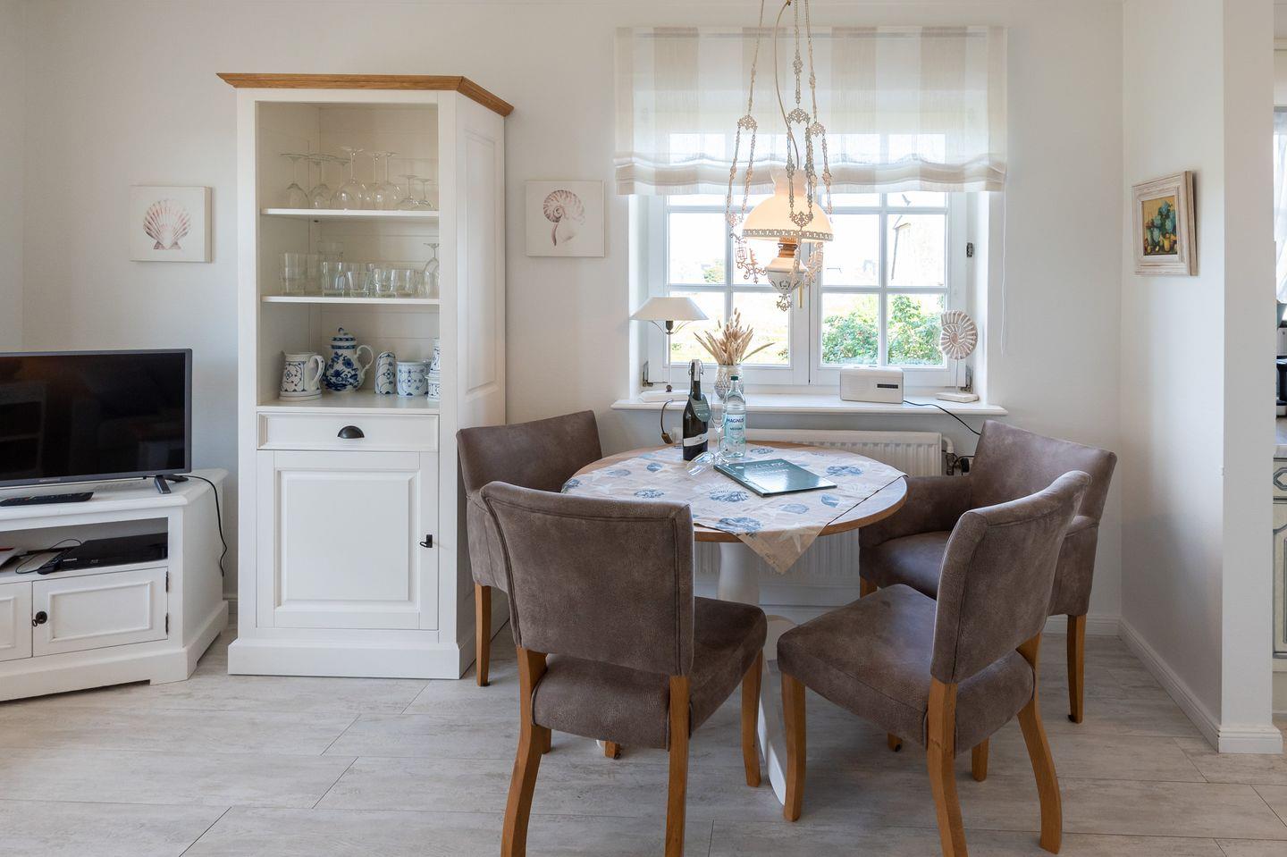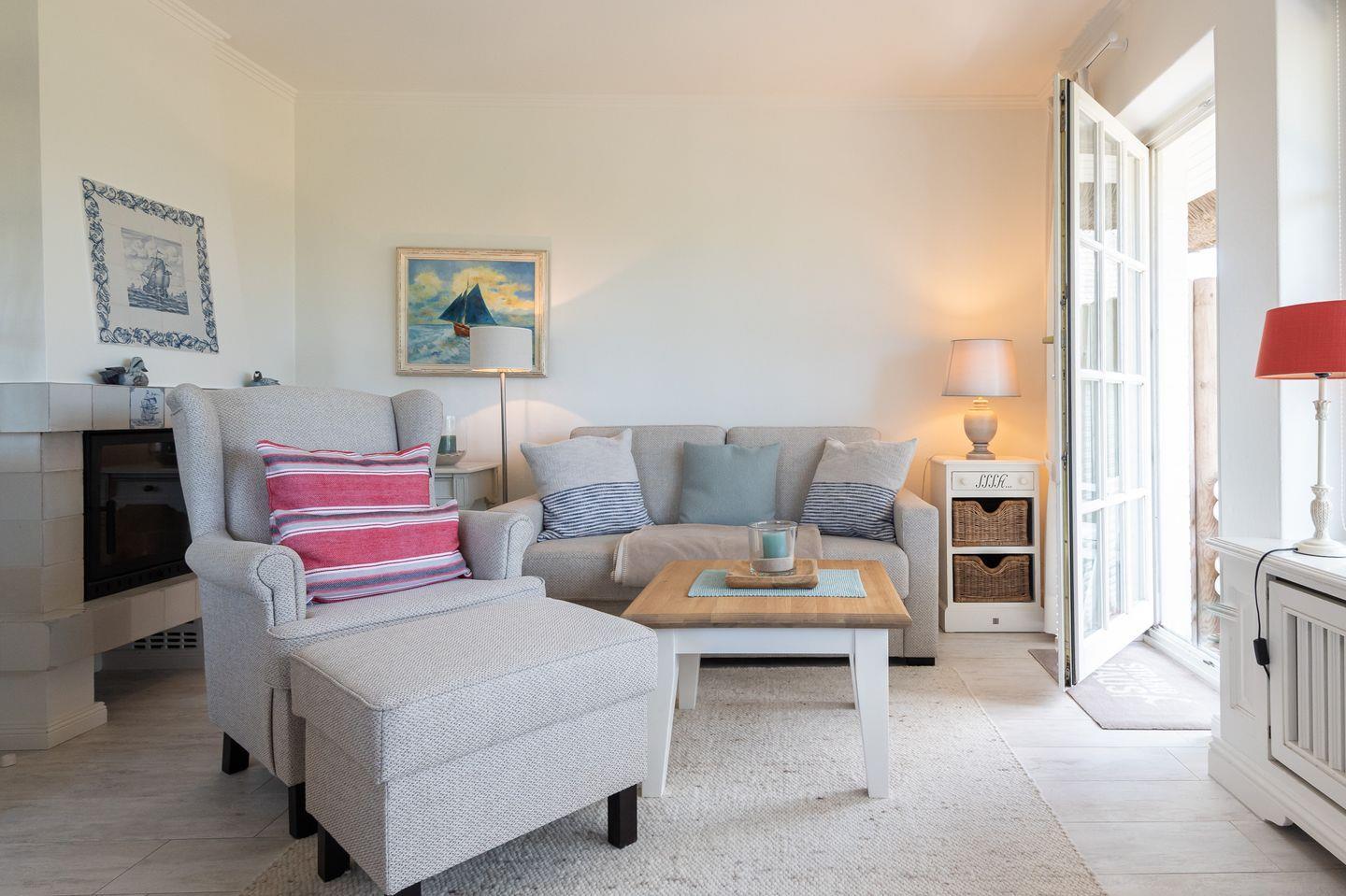 Wohn-/Koch-/Esszimmer: Einbauküche mit allem Komfort und gemütlicher Essgruppe. Der Sitzbereich am offenen Kamin ist mit hochwertigen Polstermöbeln und TV ausgestattet. Außerdem befinden sich hier der Zugang zur Terrasse mit Strandkorb, sowie zum großflächigen Heide-Gartenareal, das das Haus umrahmt.