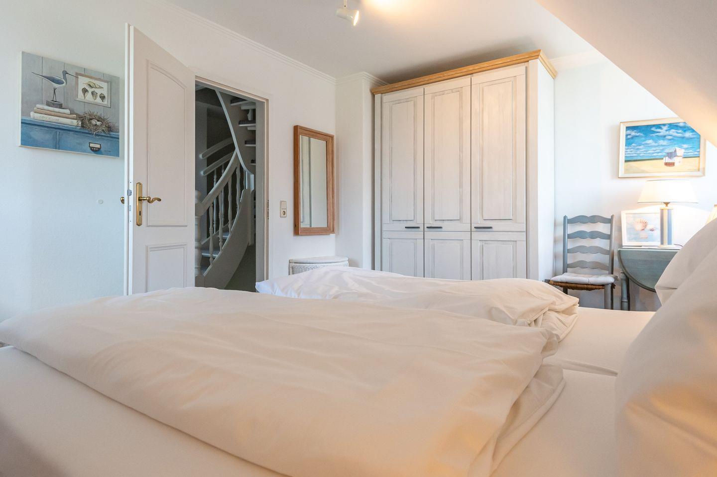Schlafzimmer 1: Doppelbett, Schrank und Fenster.