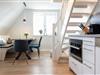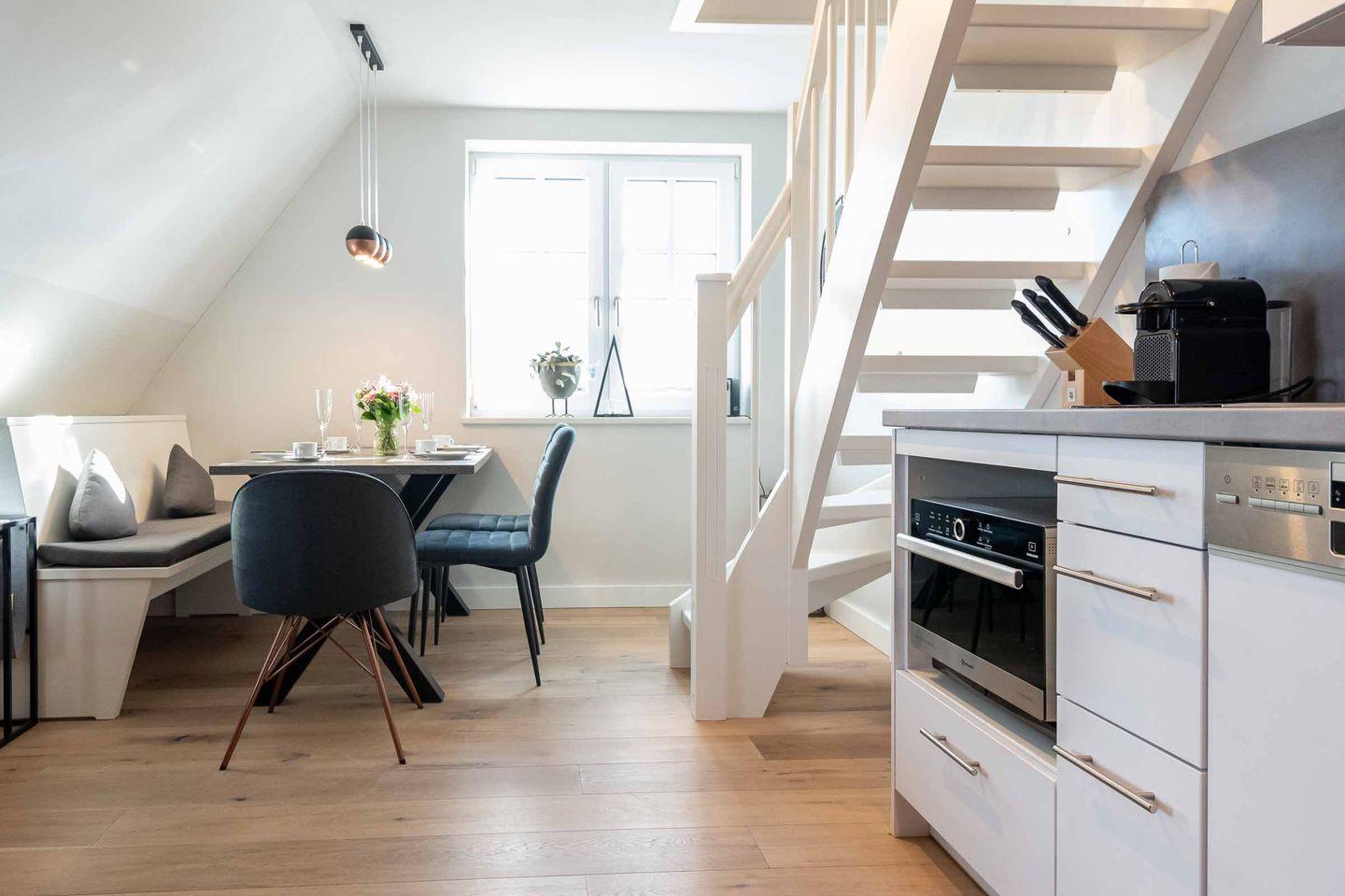 Dieses Appartement liegt im Obergeschoss über zwei Ebenen, ist durch die großen Fenster schön hell und nach Osten ausgerichtet.