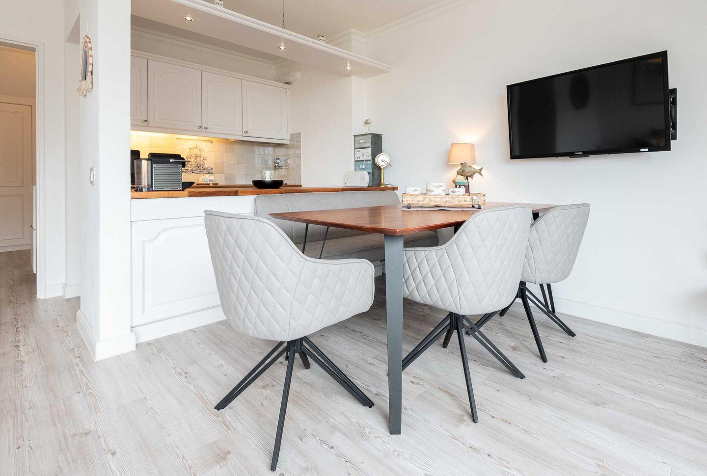 Koch-/Wohn-/Essbereich: Das lichtdurchflutete Wohnzimmer empfängt Sie mit einer gemütliche Sofaecke, die sich als Schlafstätte für zwei weitere Personen umfunktionieren lässt. Ein großer Essplatz verspricht viele entspannte Mahlzeiten. Die offene, moderne Küche wurde perfekt in den Raum integriert und grenzt sich durch einen Küchentresen optisch vom Wohnbereich ab. Sie ist hochwertig und sehr gut ausgestattet.