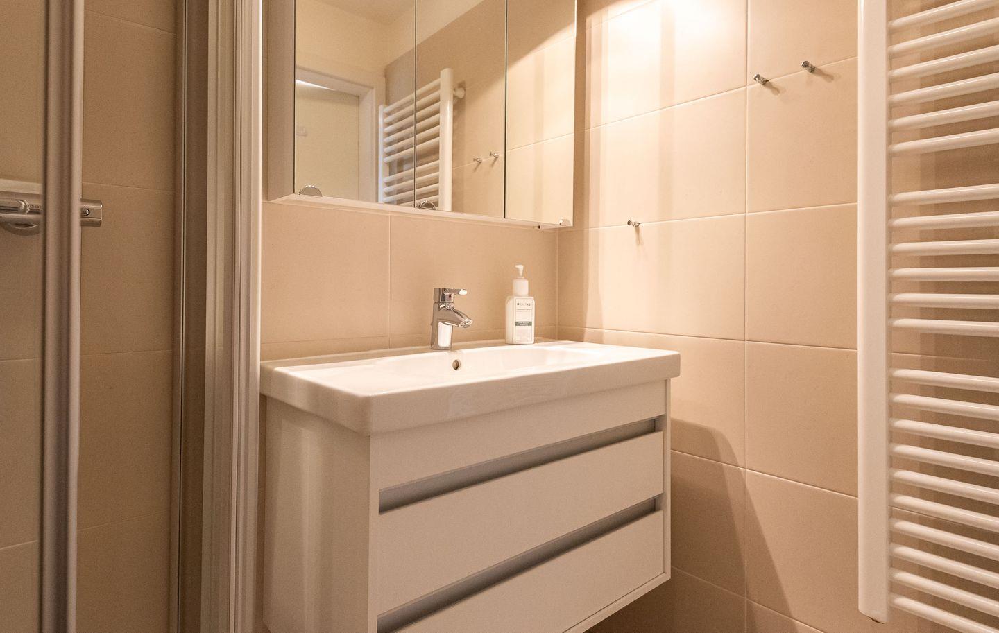 Badezimmer: Helles, modernes Duschbad mit WC.