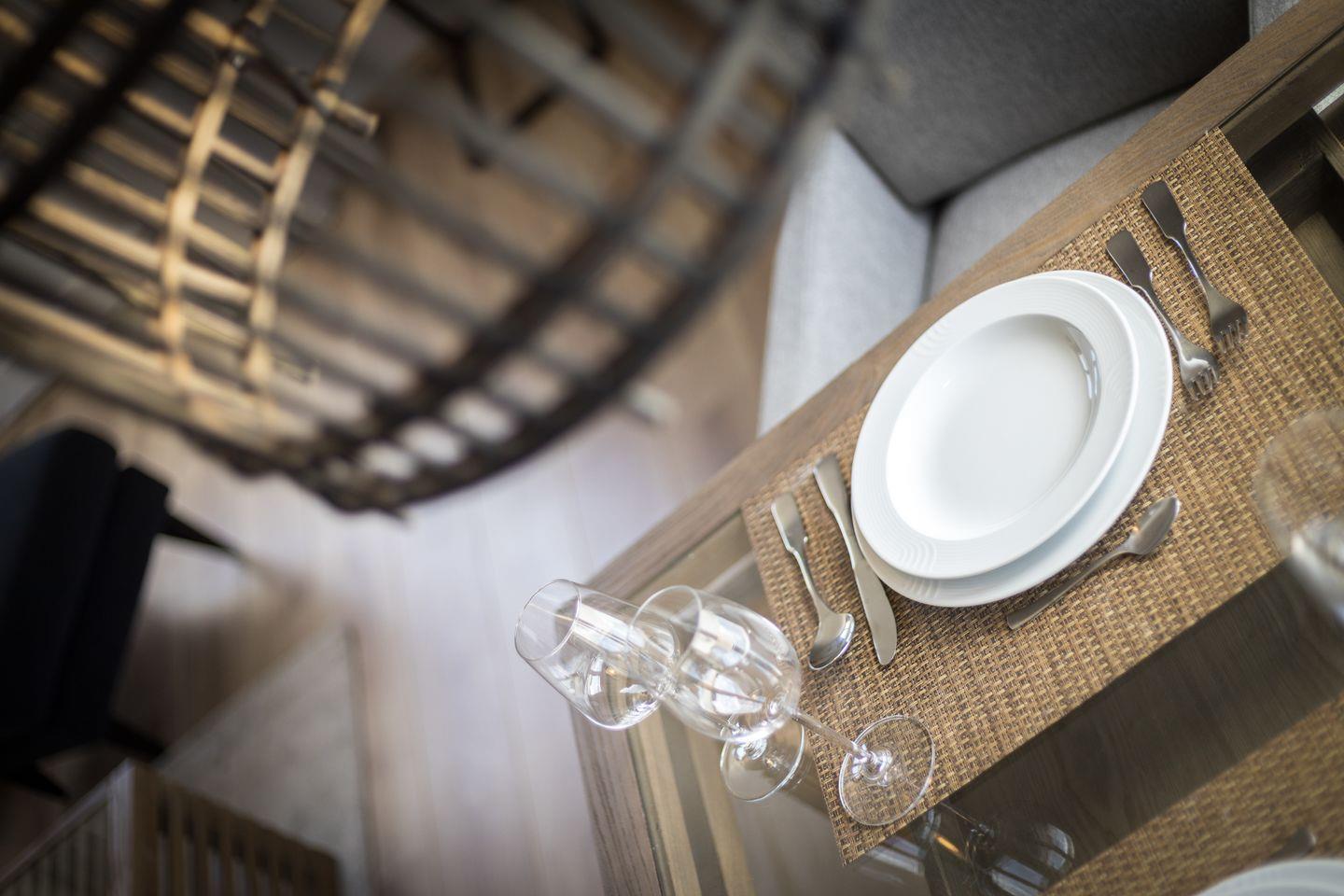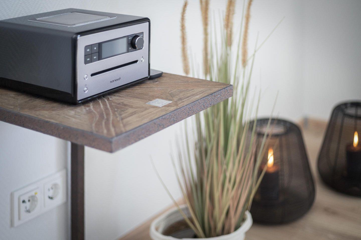 Wohn-/Essbereich: Heller, moderner Wohnbereich mit Sofaecke, TV und einem Esstisch am Fenster mit Platz für 2 Personen. Von hier gelangen Sie auch auf die schöne Ost-Terrasse.