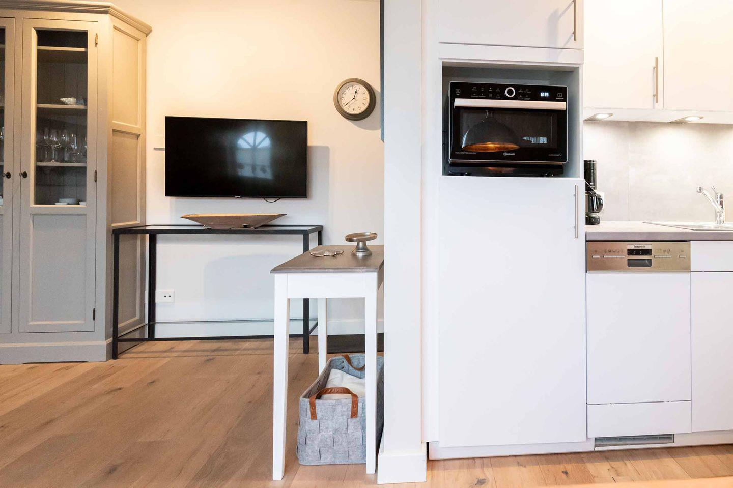 Koch-/Ess-/Wohnbereich: Neben der kleinen Küchenzeile mit Mikrowelle befindet sich der Esstisch für 4 Personen. Zudem vervollständigt eine Sitzecke mit TV den Wohnbereich. Der direkte Ausgang auf die eigene Terrasse mit Strandkorb runden den tollen Gesamteindruck ab.