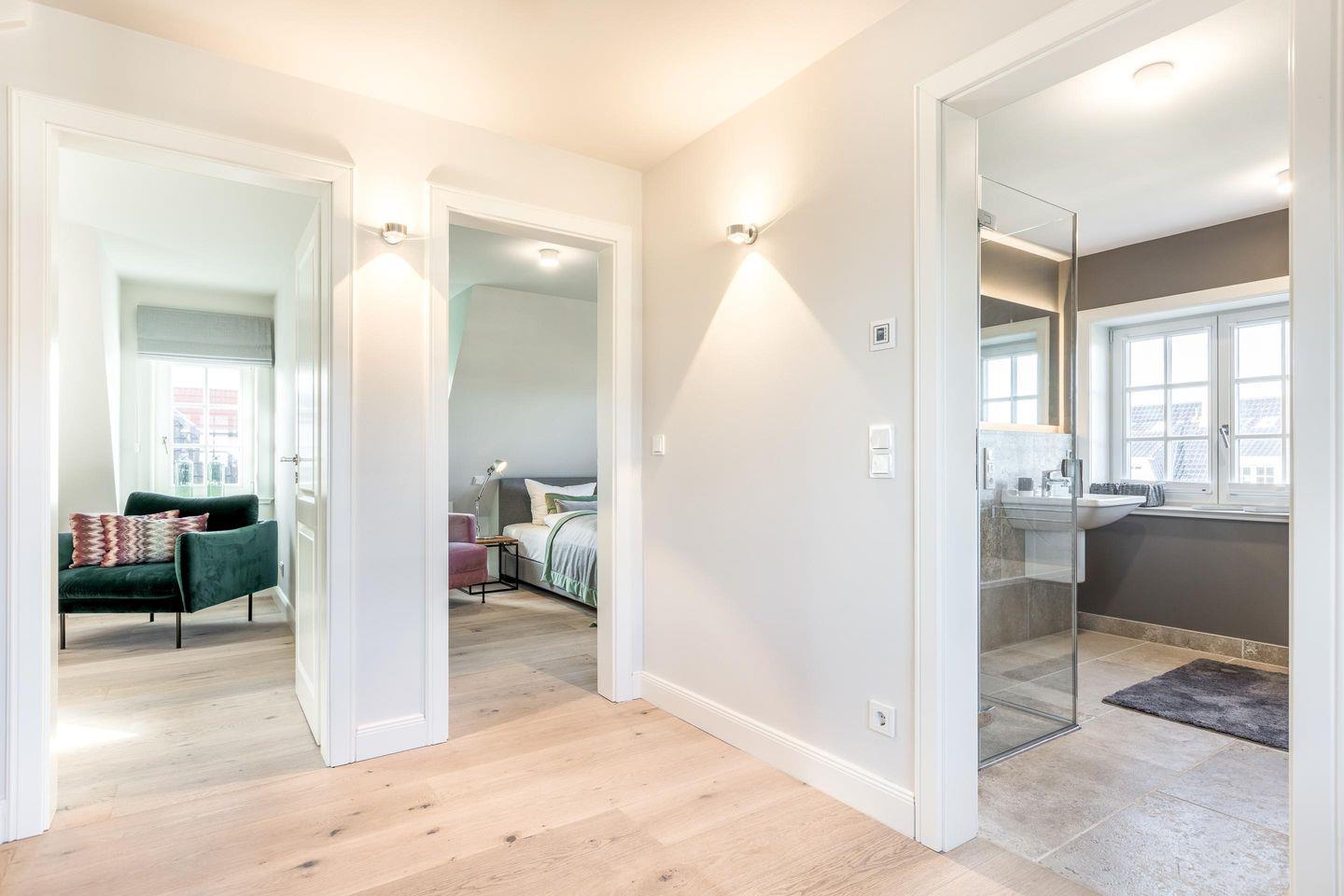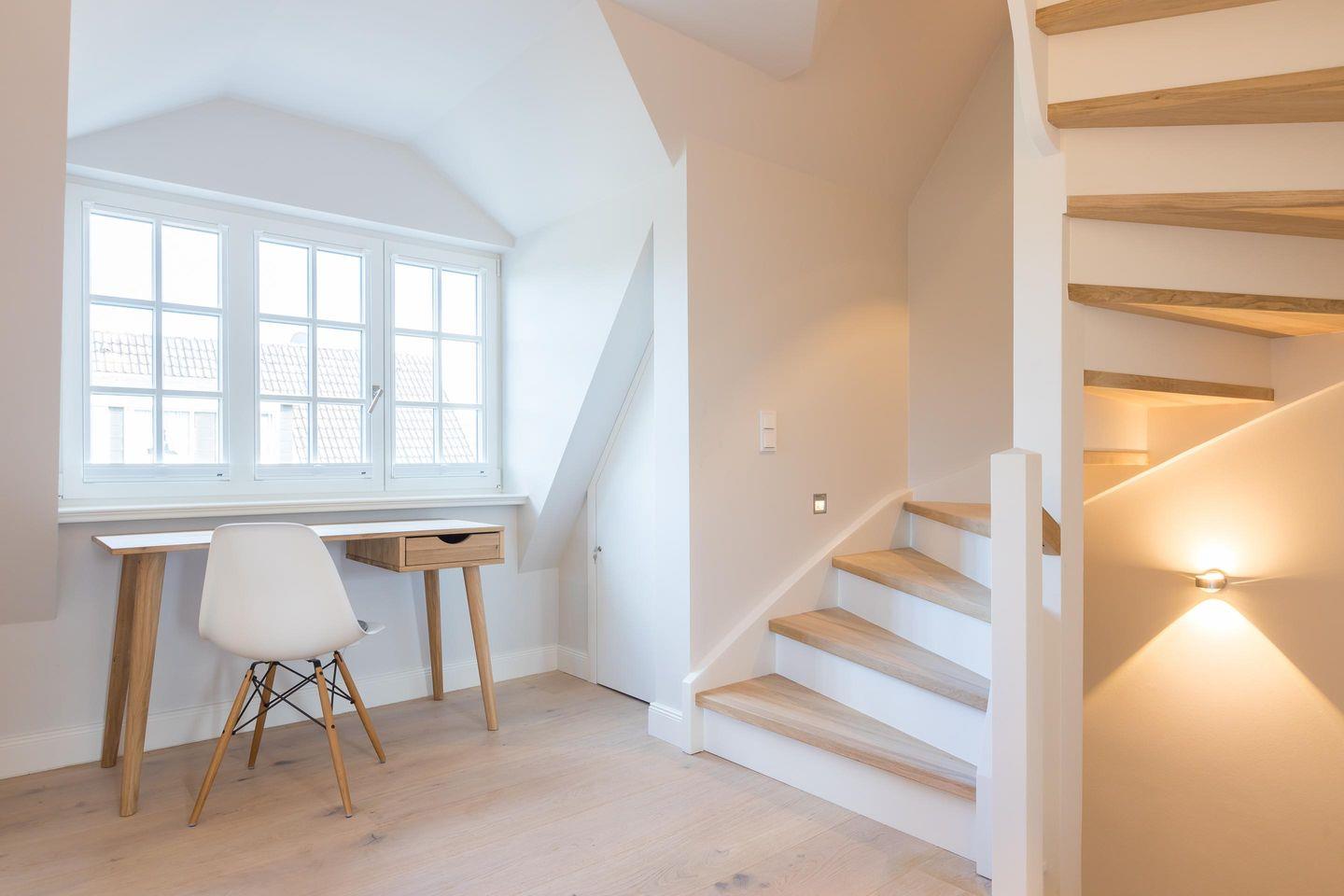 Eine Treppe führt in das helle und exklusiv eingerichtete 1. Obergeschoss: