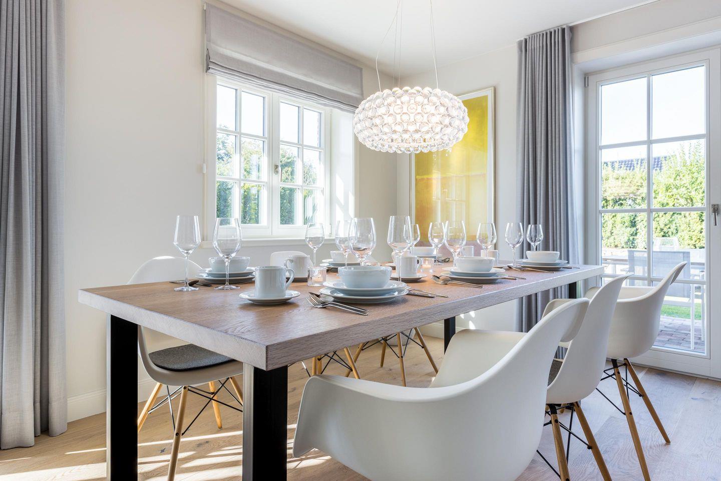 Wohn-/Essbereich mit Essecke, gemütlicher Sitzgarnitur, TV und Zugang zu den Terrassen mit Gartenmöbeln in Ost- und Westlage.