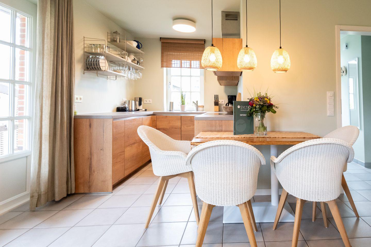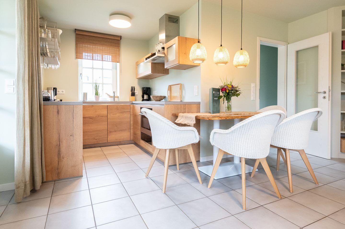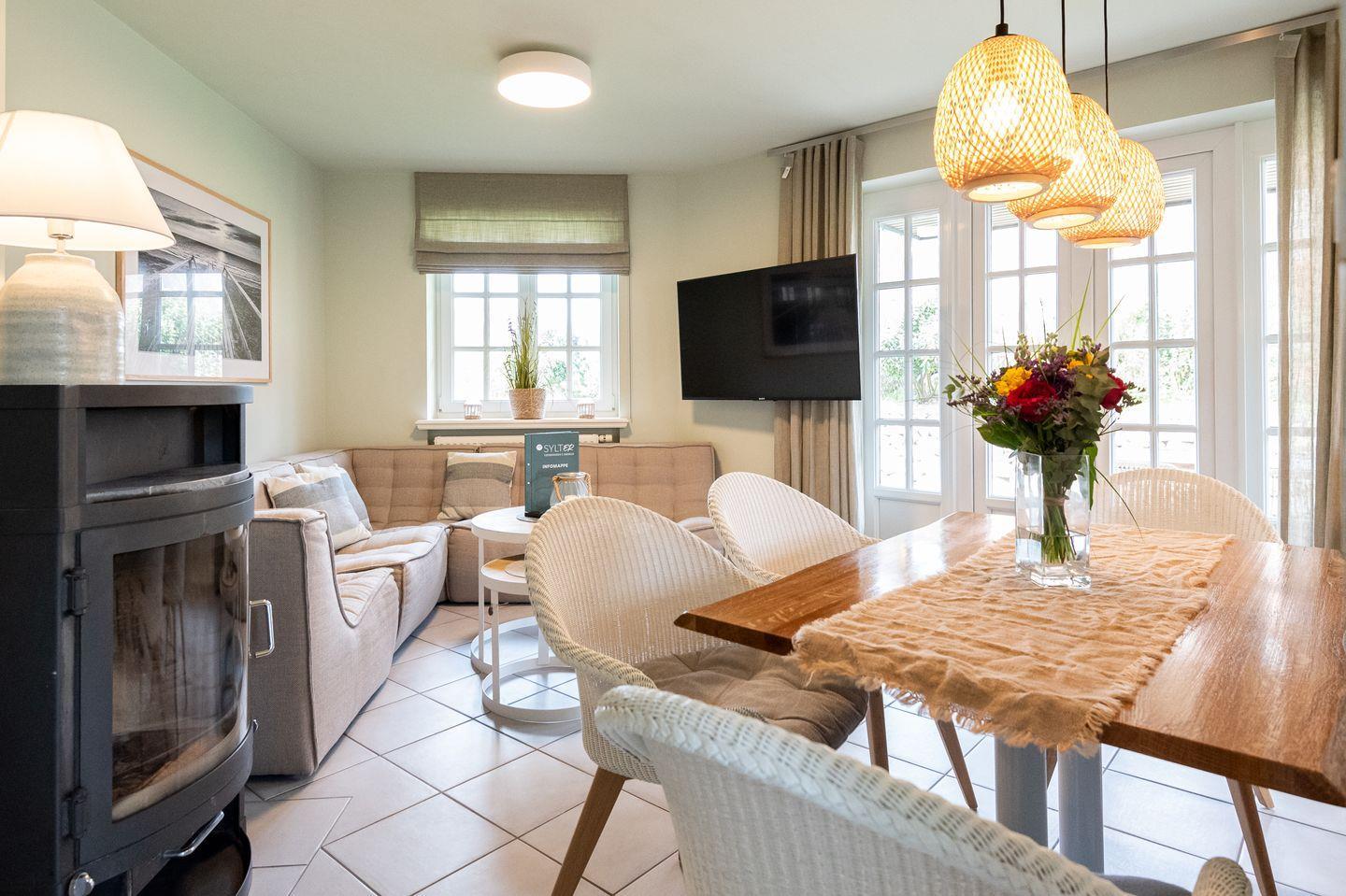 Wohn-/Koch- und Essbereich: Die offene und moderne Küche ist sehr gut ausgestattet und lässt bei Hobby-Köchen keine Wünsche offen. Eine gemütliche Sofaecke mit TV und Kaminofen verspricht gemütliche Abende. Der Wohnraum wird durch einen Essbereich abgerundet, der Platz für 4 Personen bietet. Von hier aus gelangen Sie auf die schöne West-Terrasse mit angrenzendem Garten, einem Saison-Strandkorb und Gartenmöbeln.