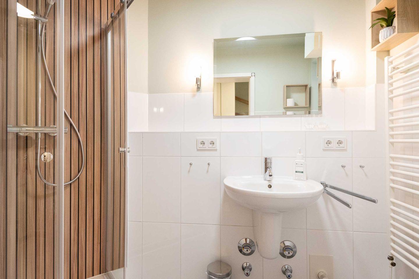 Badezimmer 1: Helles Duschbad mit WC und Fenster.