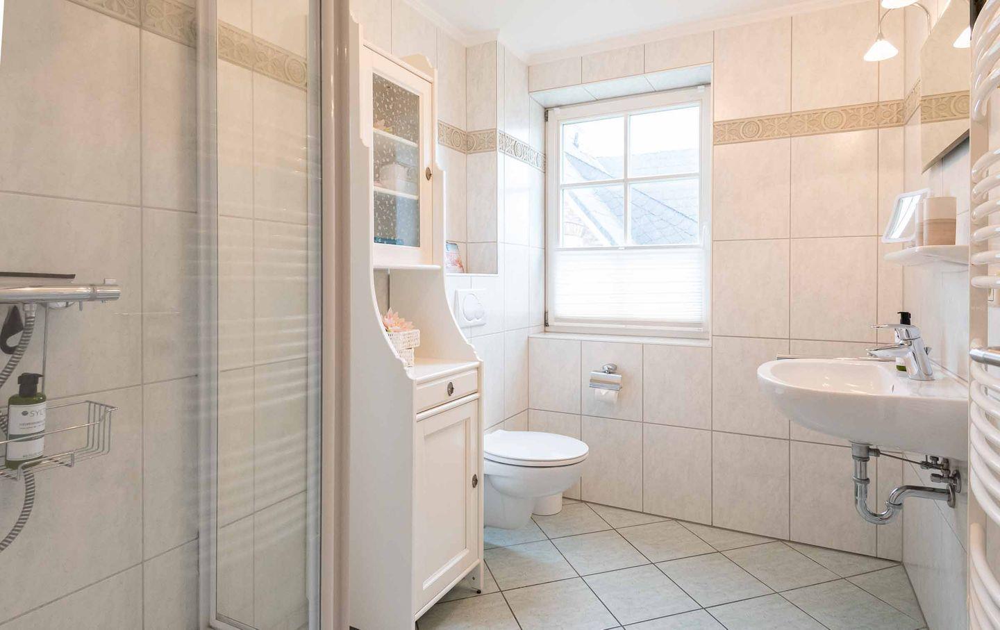 Badezimmer: Helles Duschbad mit WC und Fenster.