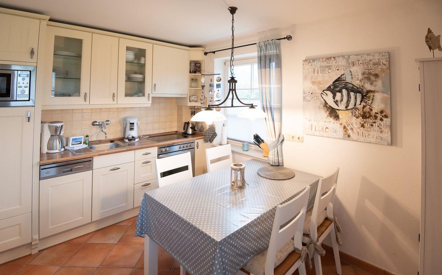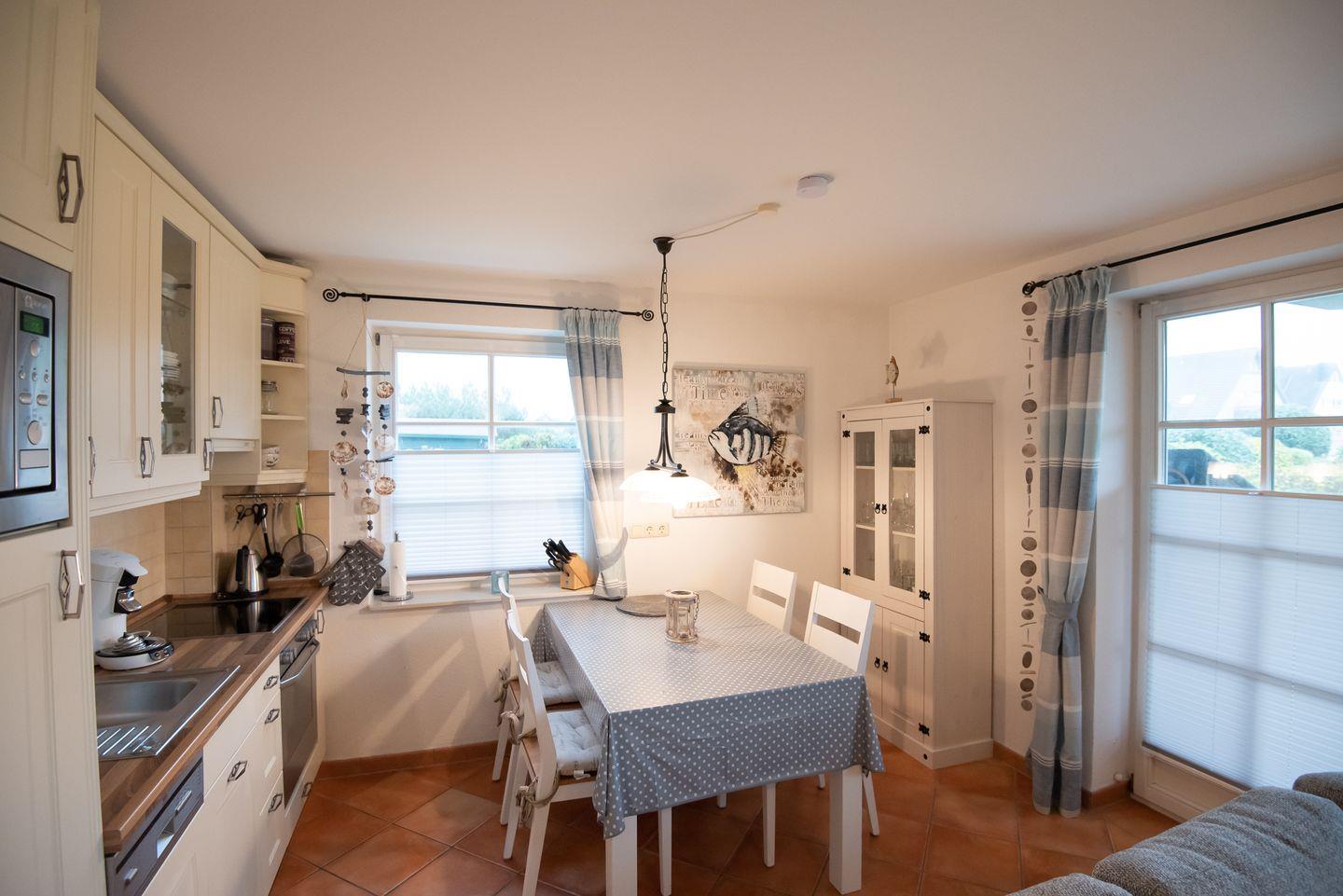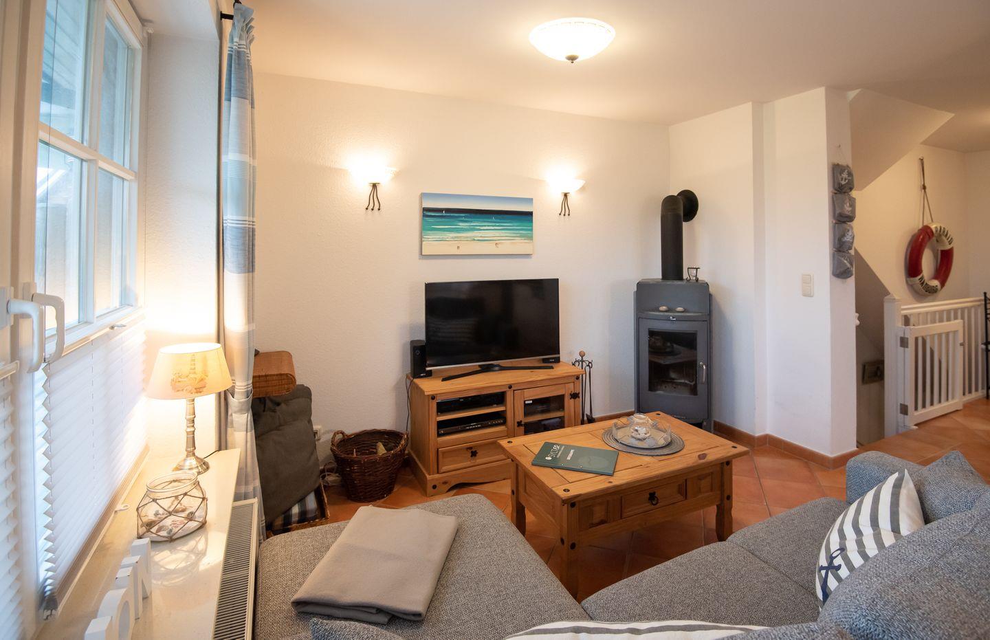 Wohn-/Koch-/Essbereich: Hier befindet sich die integrierte Küche sowie eine gemütliche Ess- und Wohnlandschaft. In der kühleren Jahreszeit genießen Sie den schönen Kaminofen. Die Terrasse mit Strandkorb und Gartenmöbeln sowie der wundervolle Garten schließen direkt an das Wohnzimmer an.