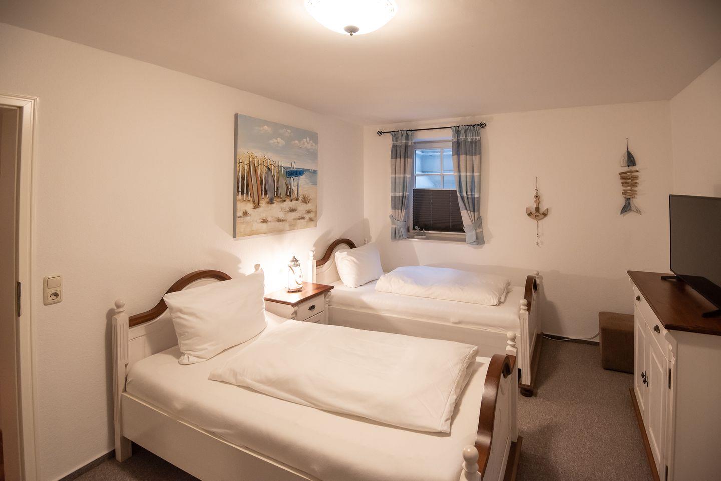 Schlafzimmer 2: Schöner, geräumiger Schlafraum mit zwei Einzelbetten, sowie zusätzlichem Kinderbett und Fenster.