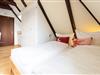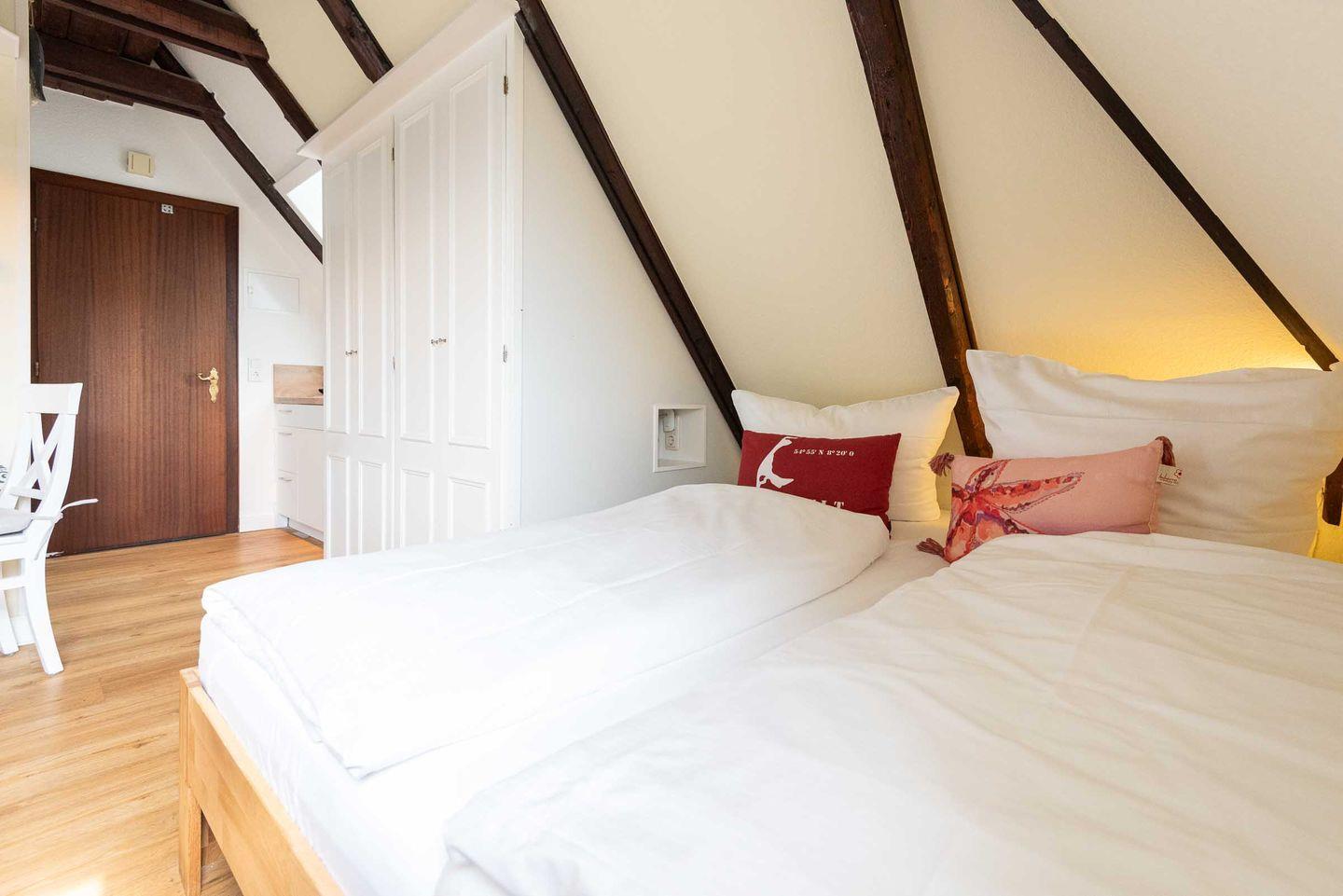 Wohn-/Schlaf-/Essbereich: Das gemütliche Zimmer unter Dachbalken verfügt über ein Doppelbett, eine kleine Esstischecke sowie eine Sofaecke mit Sessel und TV, die zum Verweilen einladen.
