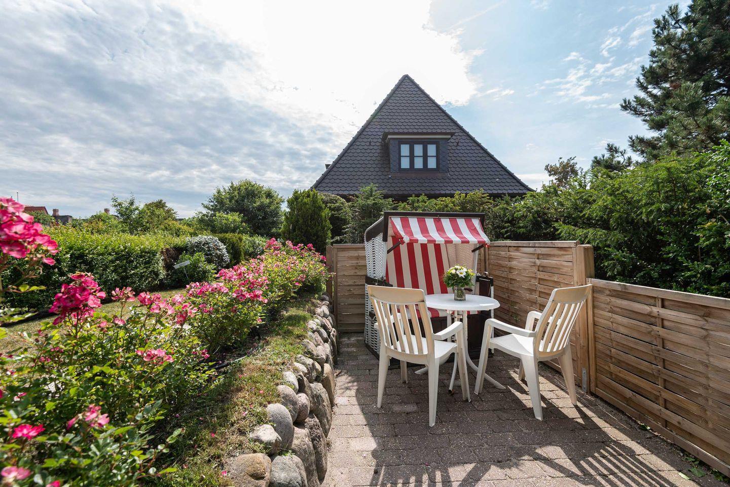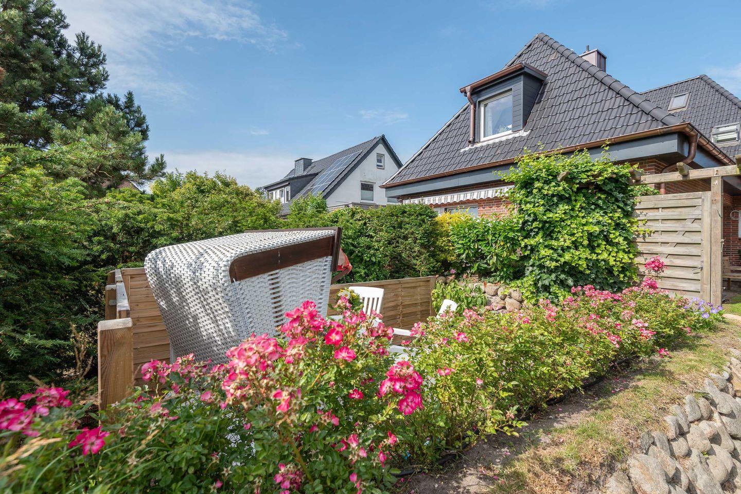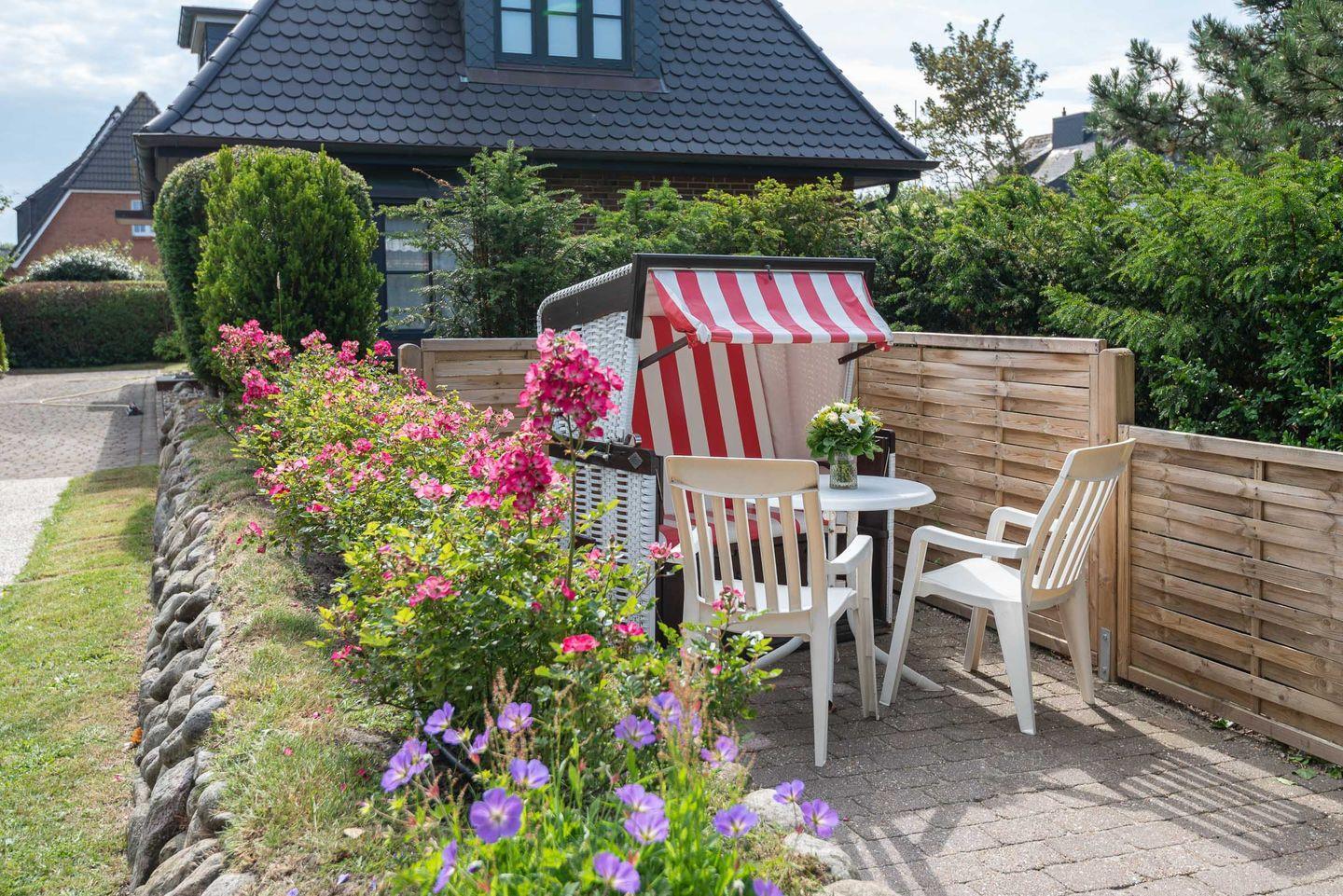 Besonderheiten: Zu der Ferienwohnung gehört eine kleine, begrünte Terrasse mit einem Strandkorb und Gartenmöbeln.